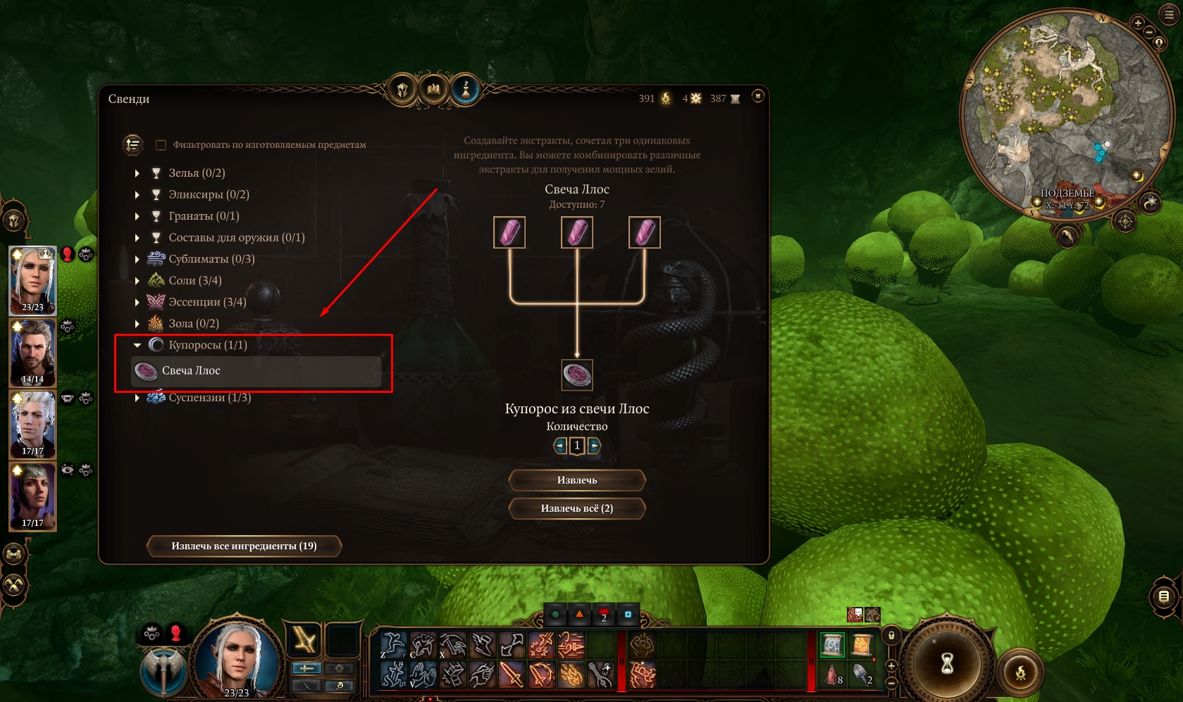 В разделе «Купоросы» выберите «Свеча Ллос», а затем кликните по кнопке «Извлечь» в правой части окна, чтобы переработать материал в х1 «Купорос из свечи Ллос». Как только вы это сделаете, рецепт на изготовление Злобы будет разблокирован.