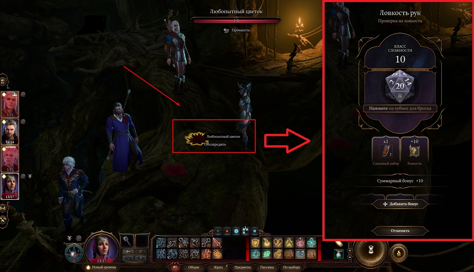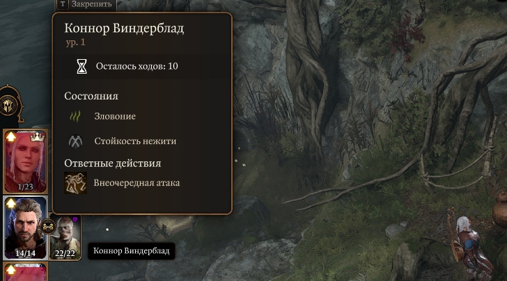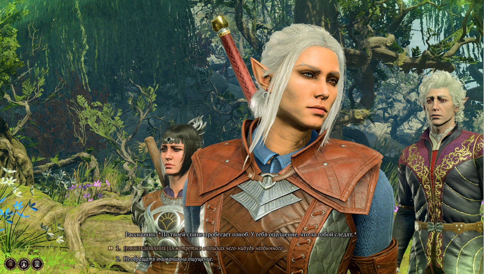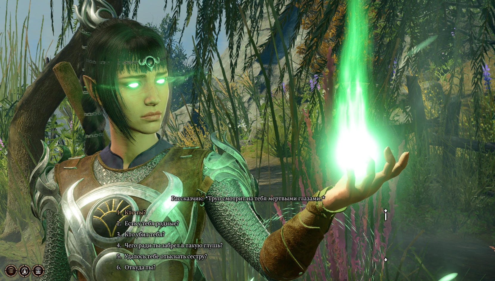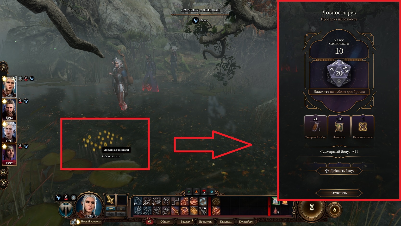 Вне зависимости от принятого ранее решения, отправляйтесь исследовать болотистую местность. На входе в локацию запустится кат-сцена. В ней вам предложат осмотреться или не обращать внимание на странные ощущения. При выборе варианта с расследованием придется пройти проверку на интеллект (КС 20).