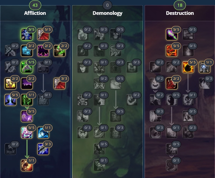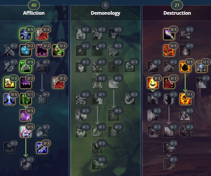 Второй билд похож на первый, однако в нем Нестабильное колдовство и Темный пакт уступают место талантам из "Разрушения" (в частности, Разгром значительно усиливает урон от Стрела Тьмы). Такой чернокнижник по-прежнему обеспечивает рейд эффектами Объятия Тьмы и Злое слово, а его основная задача сводится к поддержанию на цели Проклятие стихий.