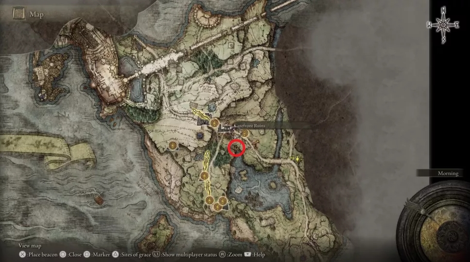 - Побережье в замке Морн (восточная часть замка, труп на поваленном стуле, 1 камень мрака Т2, камень охраняют духи медуз)