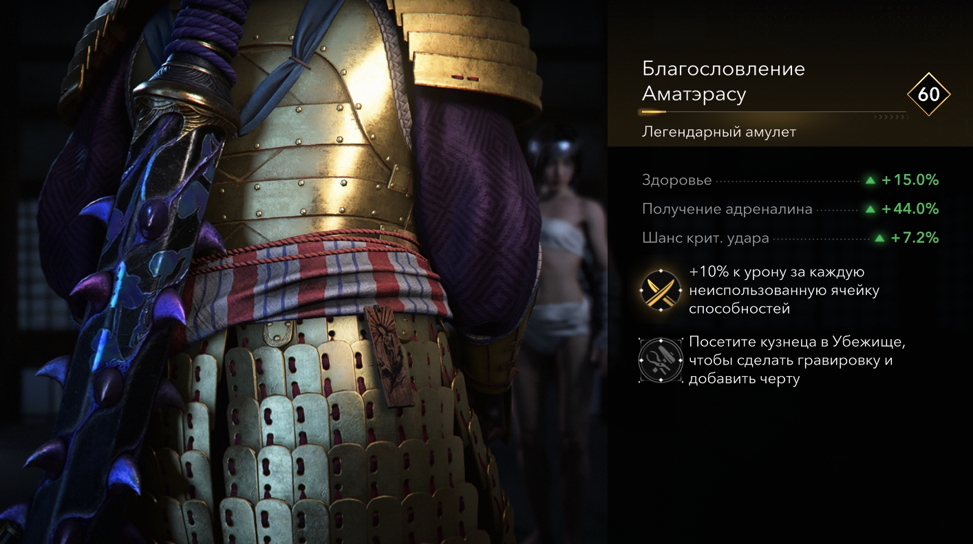После того, как вы наденете Благословение Аматэрасу, не забудьте нанести на него одну из перечисленных выше гравировок, посетив кузнеца в убежище.