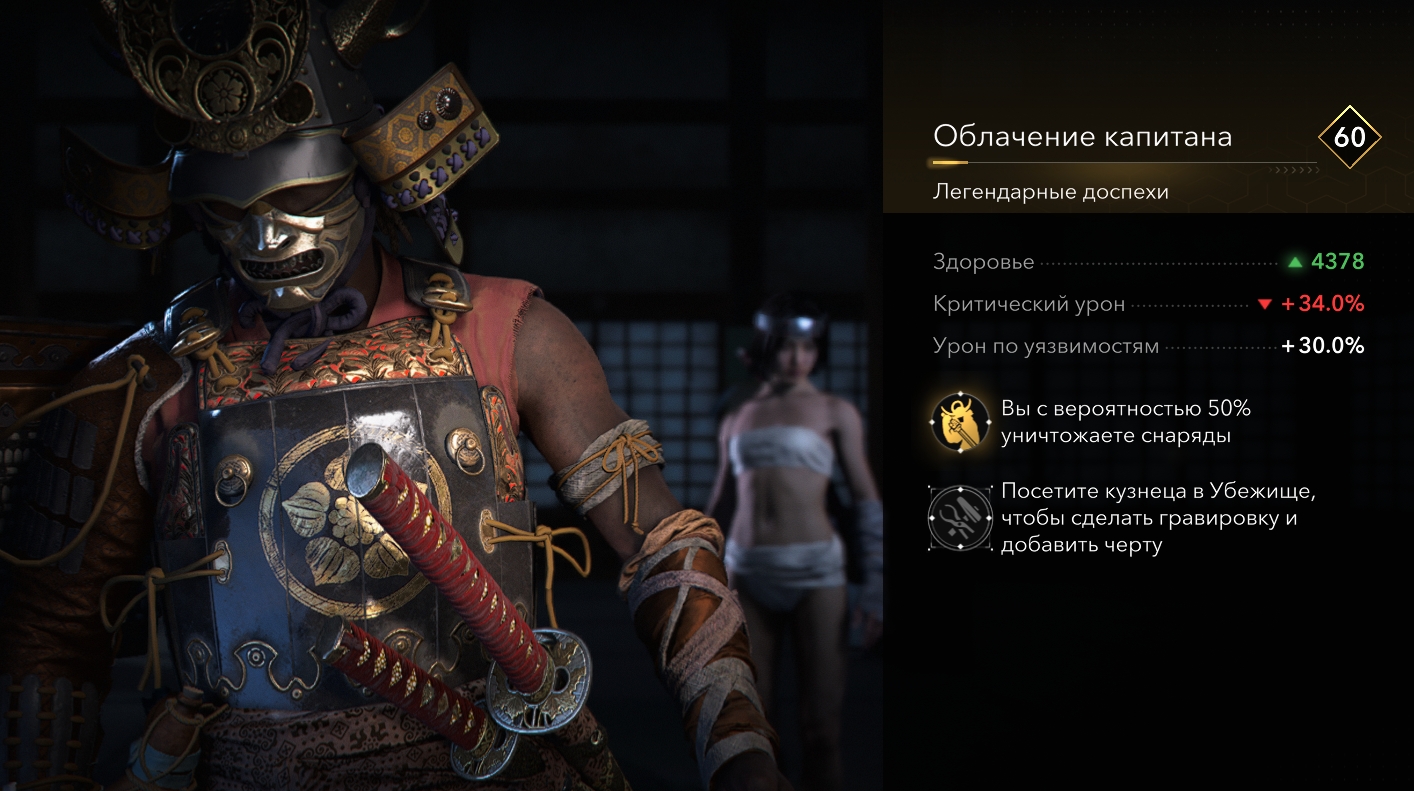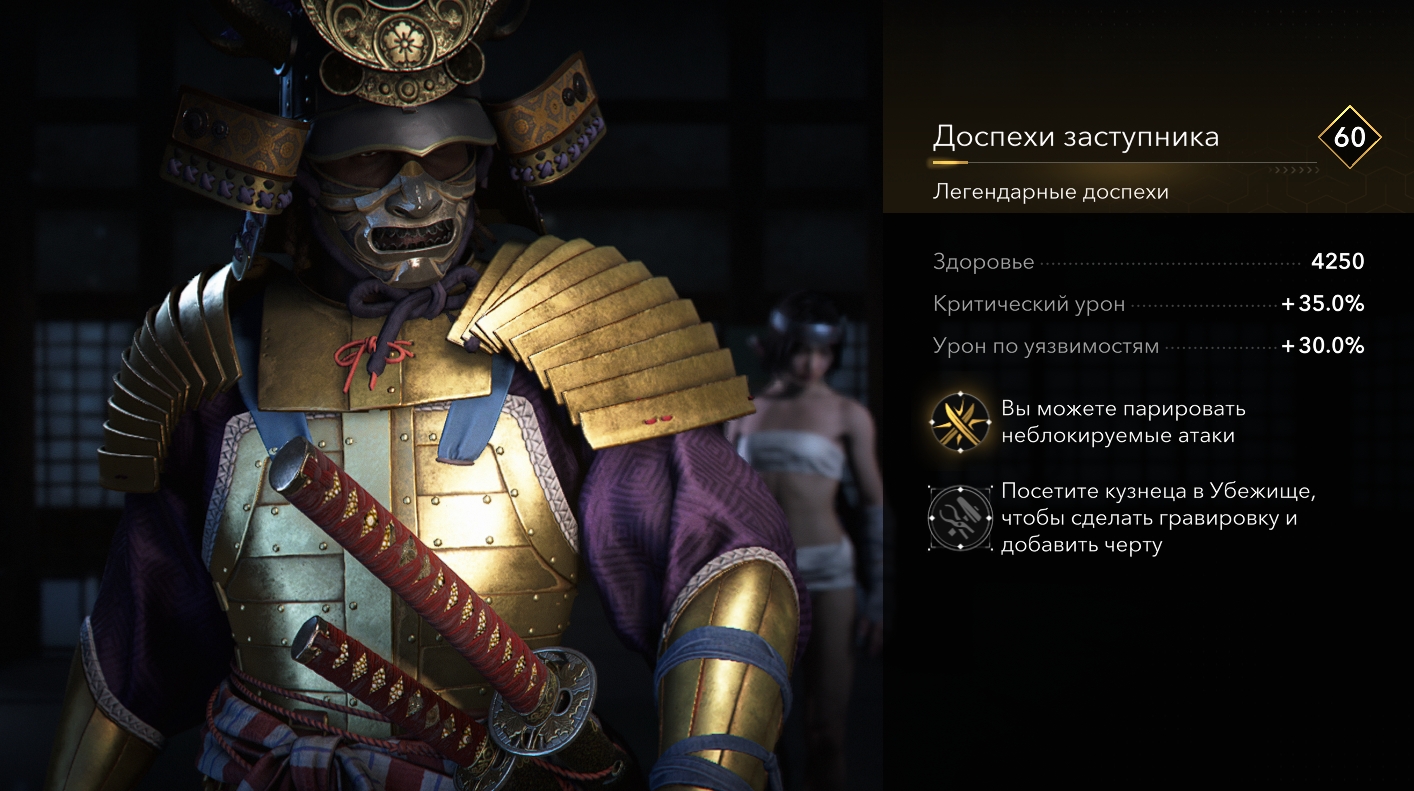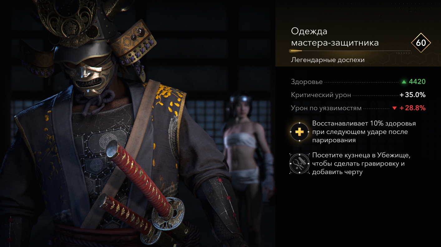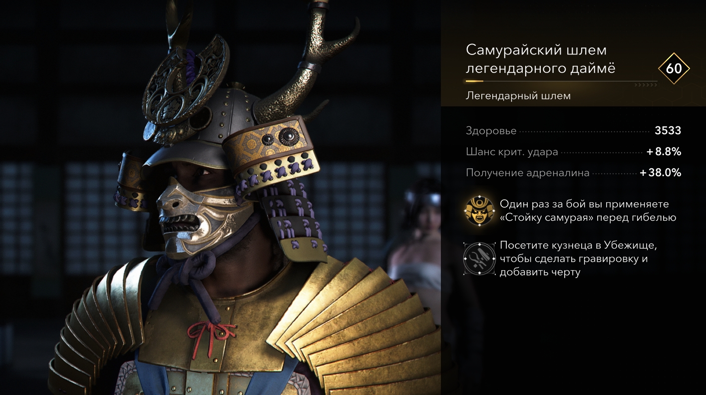 • Самурайский шлем легендарного даймё. Позволяет применить перед гибелью «Стойку самурая» (срабатывает не чаще 1 раза за бой). С его помощью персонаж сможет избежать смерти в ходе одного сражения, что является неплохим бонусом.