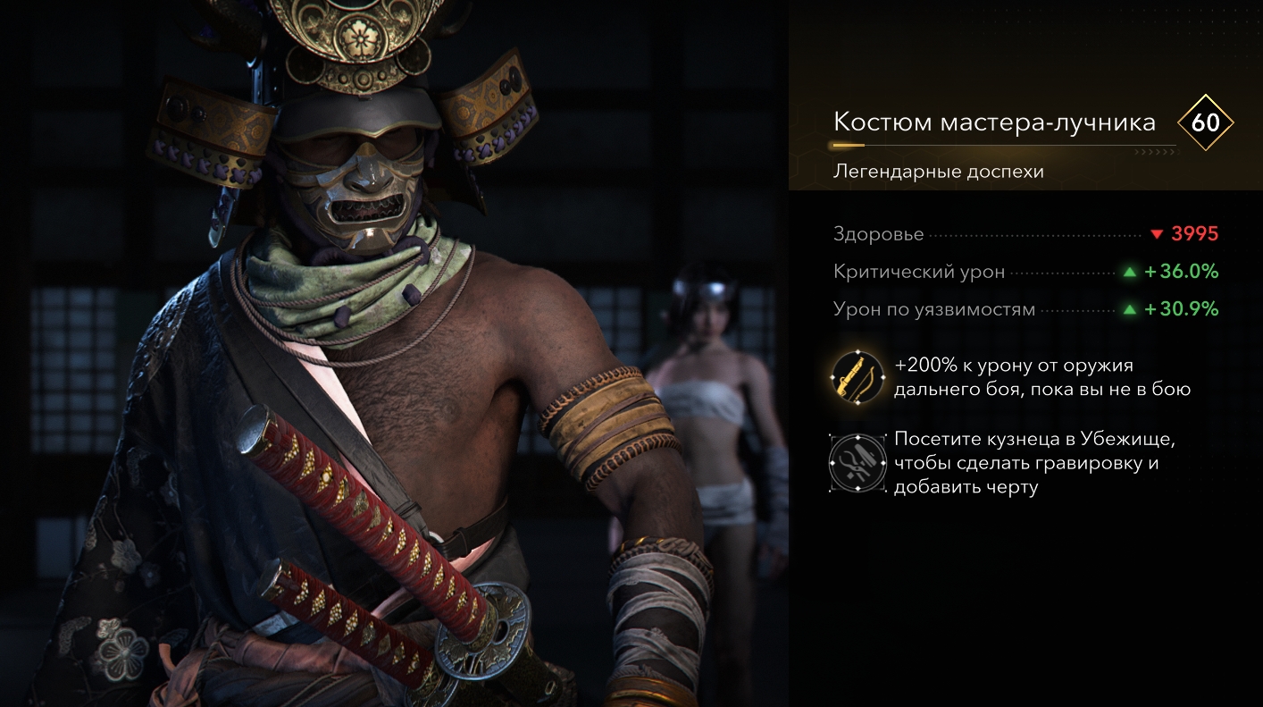Обратите внимание на то, что Ясукэ изначально задумывался как настоящий суровый боец, а не персонаж, специализирующийся на стелсе. Именно поэтому вся подходящая ему экипировка дает преимущества в открытом сражении, за исключением Костюма мастера лучника – этот предмет снаряжения отлично сочетается со скрытным стилем игры.