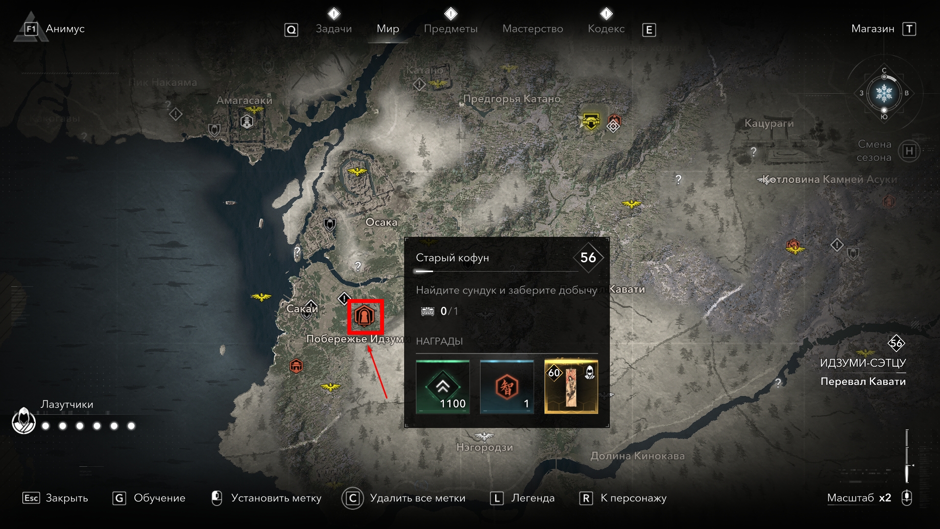 • Находится на верхнем этаже главного здания в Замке Сакамото в Оми. Чтобы открыть сундук с доспехом, осмотрите прилегающую к замку территорию и убейте трех самураев-дайсё. Его точное местоположение отмечено на скриншотах ниже