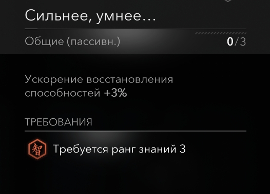 В этом разделе находятся навыки, дающие главному герою дополнительные боевые преимущества. Обратите внимание на то, что мы рекомендуем открывать только пассивные навыки, чтобы сэкономить очки мастерства, которые лучше всего потратить на развитие других более важных деревьев, таких как «Окатана» и «Самурай».