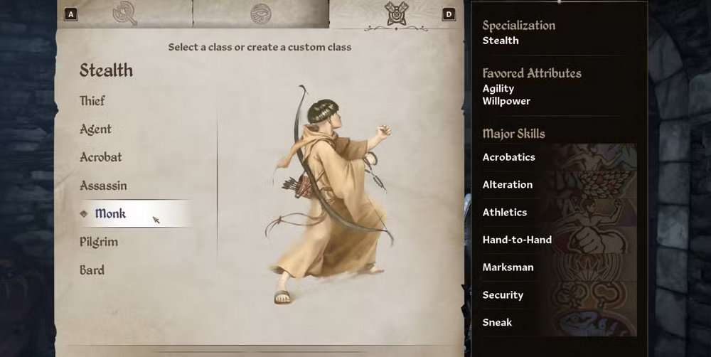 Монах является достаточно интересным классом, так как он ориентируется на скрытность, а основными характеристиками является сила воли и ловкость. Среди главных атрибутов рекомендуется выбирать стрелка, изменение, акробатику, атлетику, безопасность и элементы, связанные со стелсом. В основном монах старается эффективно использовать лук на расстоянии и применять навыки рукопашного боя, если приходится сталкиваться с противником в ближнем бою. При этом, прокачивая характеристики можно полагаться на возможность уклоняться и высокого прыгать, что станет основой в плане тактики.
