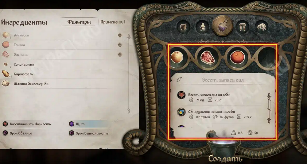 | Мастер | 100 | Дает возможность готовить зелья всего лишь из одного ингредиента, то при этом вы получаете только первый выбранный эффект. |