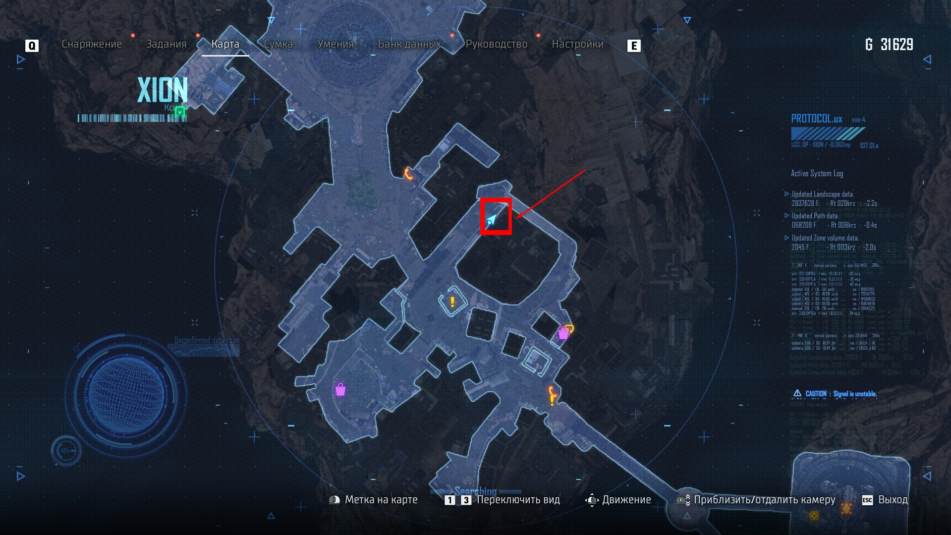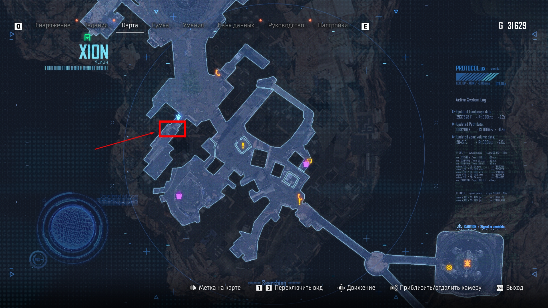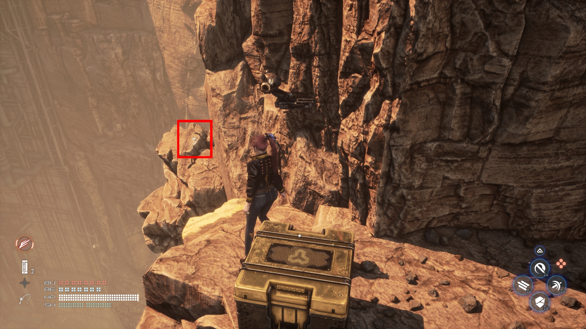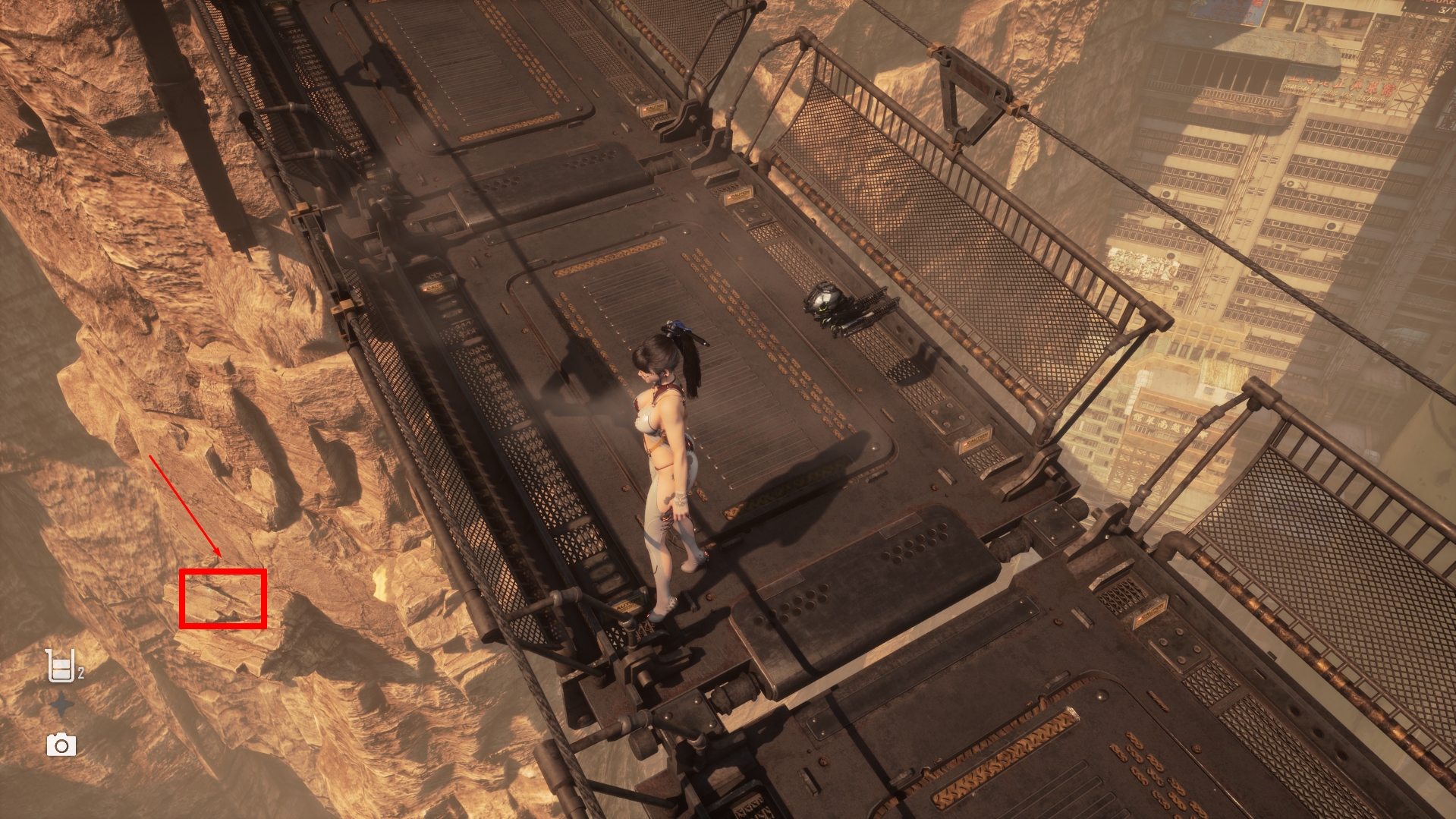 Последняя банка в Ксионе спрятана в крайне неожиданном месте. Отправляйтесь к главному входу в город (со стороны площадки с тетраподом) и дойдите до конца первого моста. Справа от него вы увидите трос. Воспользуйтесь им, чтобы спуститься ниже на скалу.