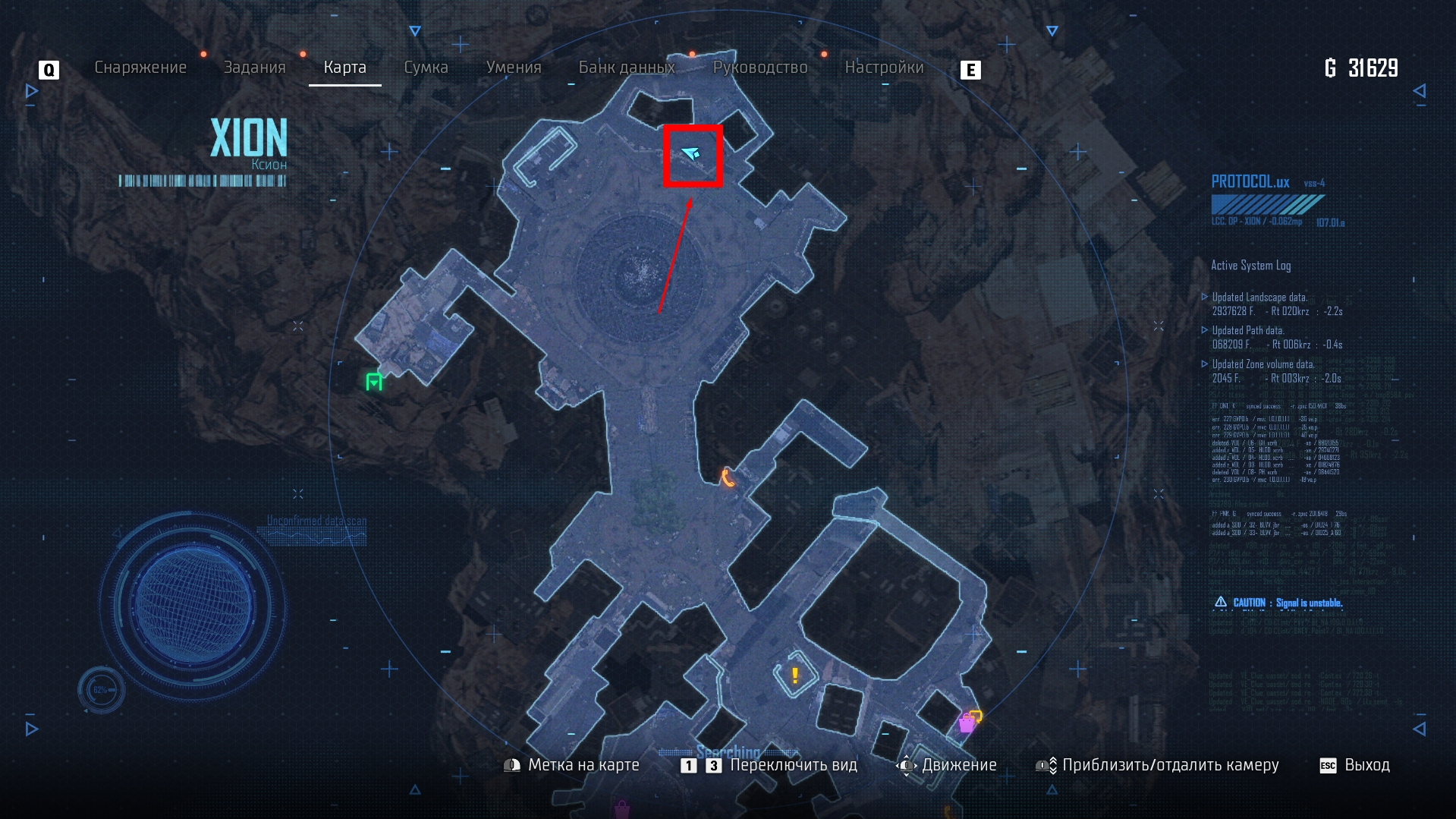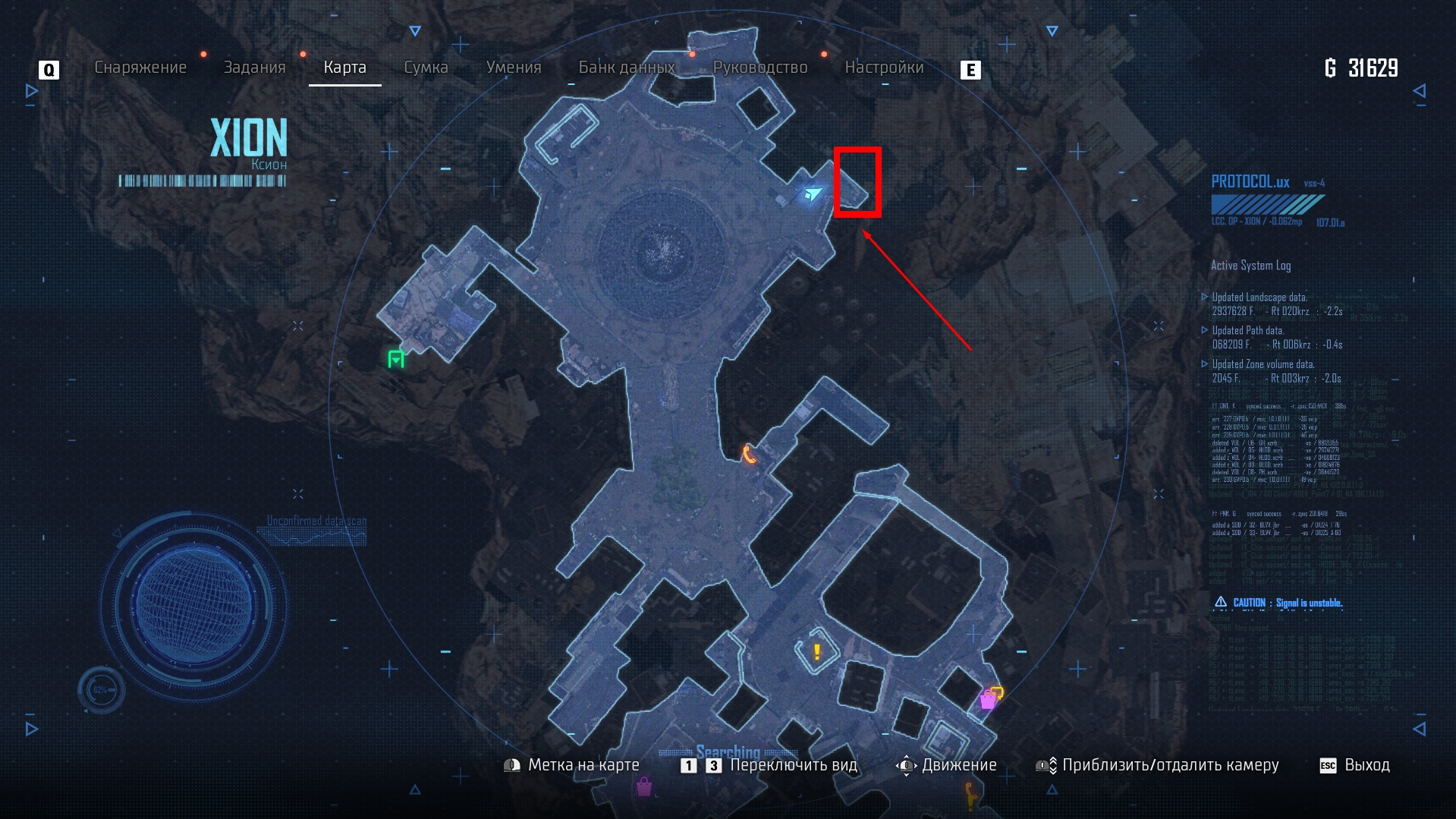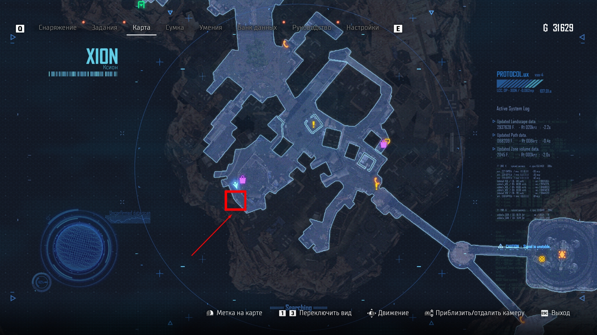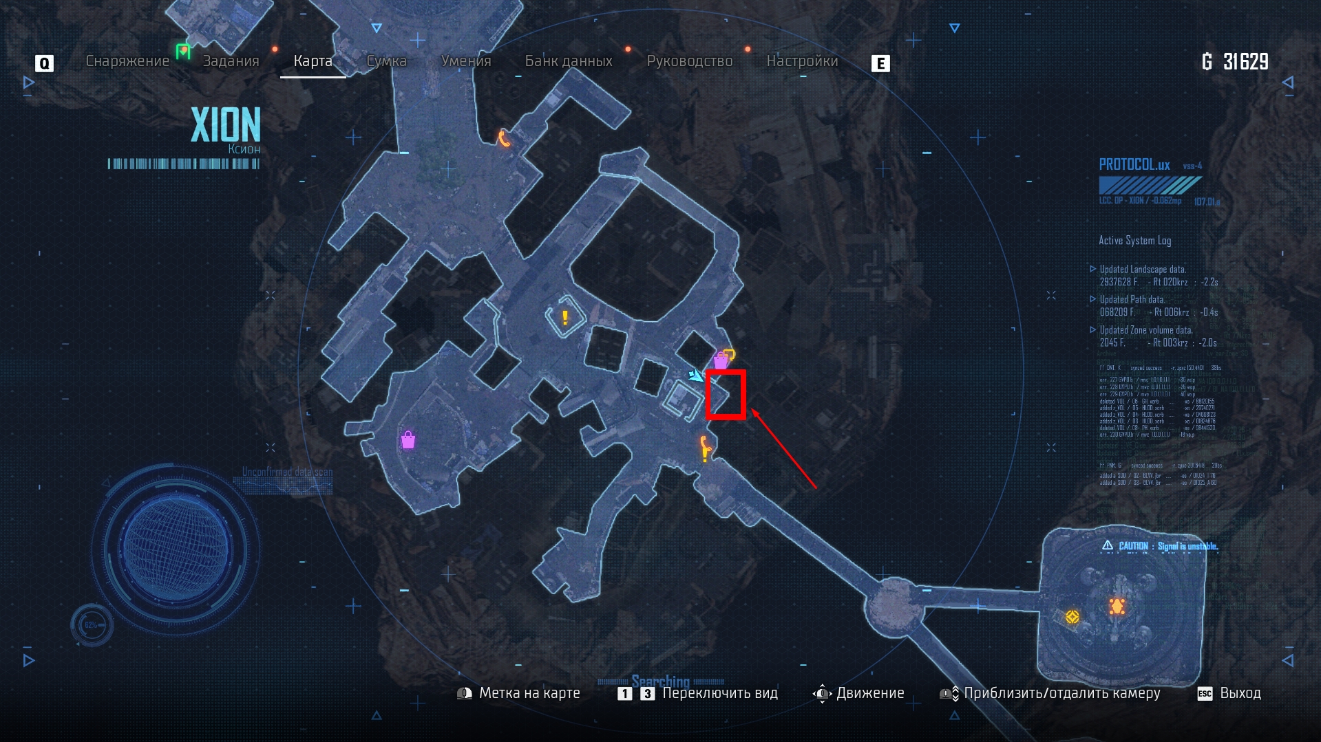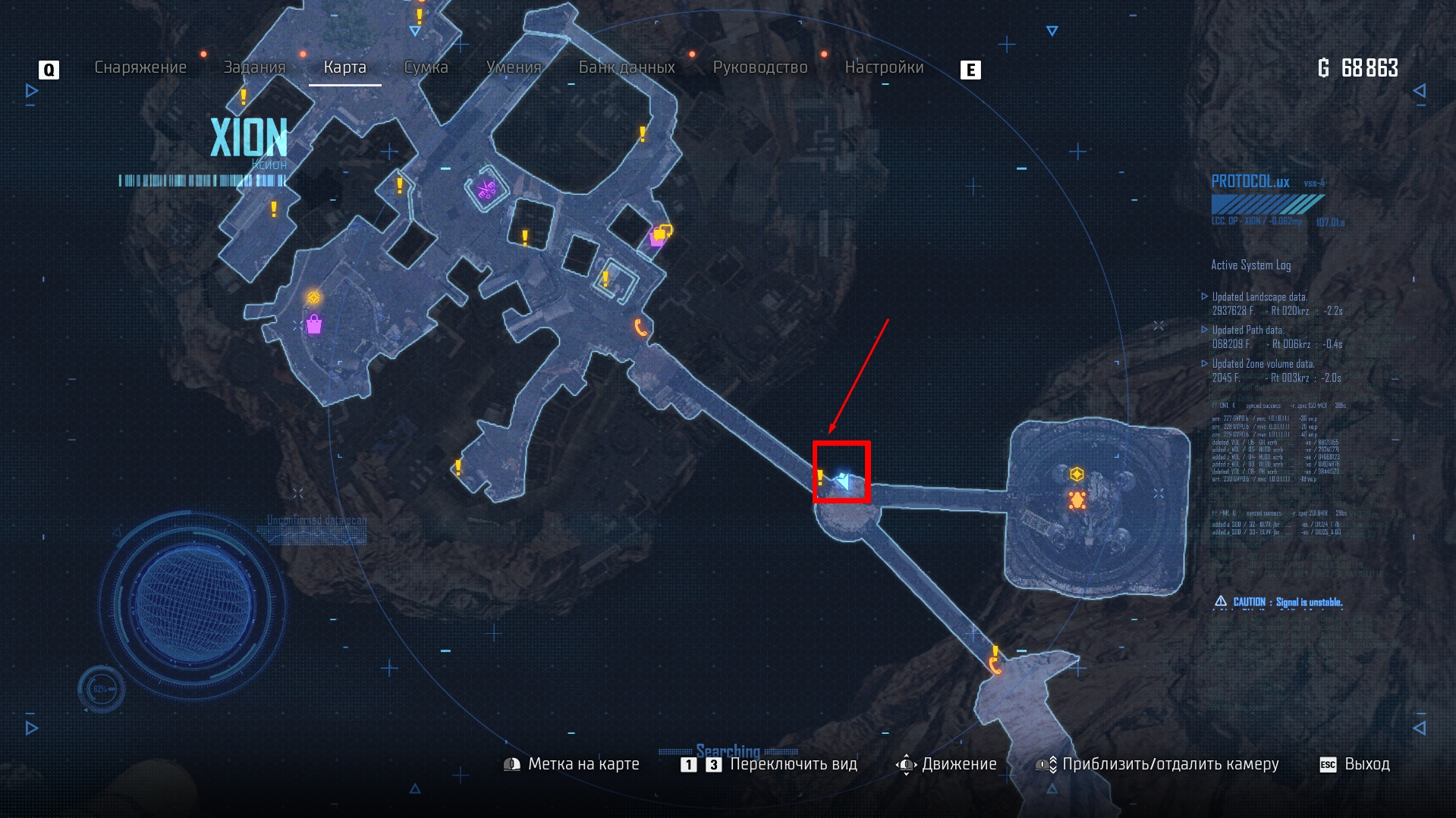 Последняя банка в Ксионе спрятана в крайне неожиданном месте. Отправляйтесь к главному входу в город (со стороны площадки с тетраподом) и дойдите до конца первого моста. Справа от него вы увидите трос. Воспользуйтесь им, чтобы спуститься ниже на скалу.