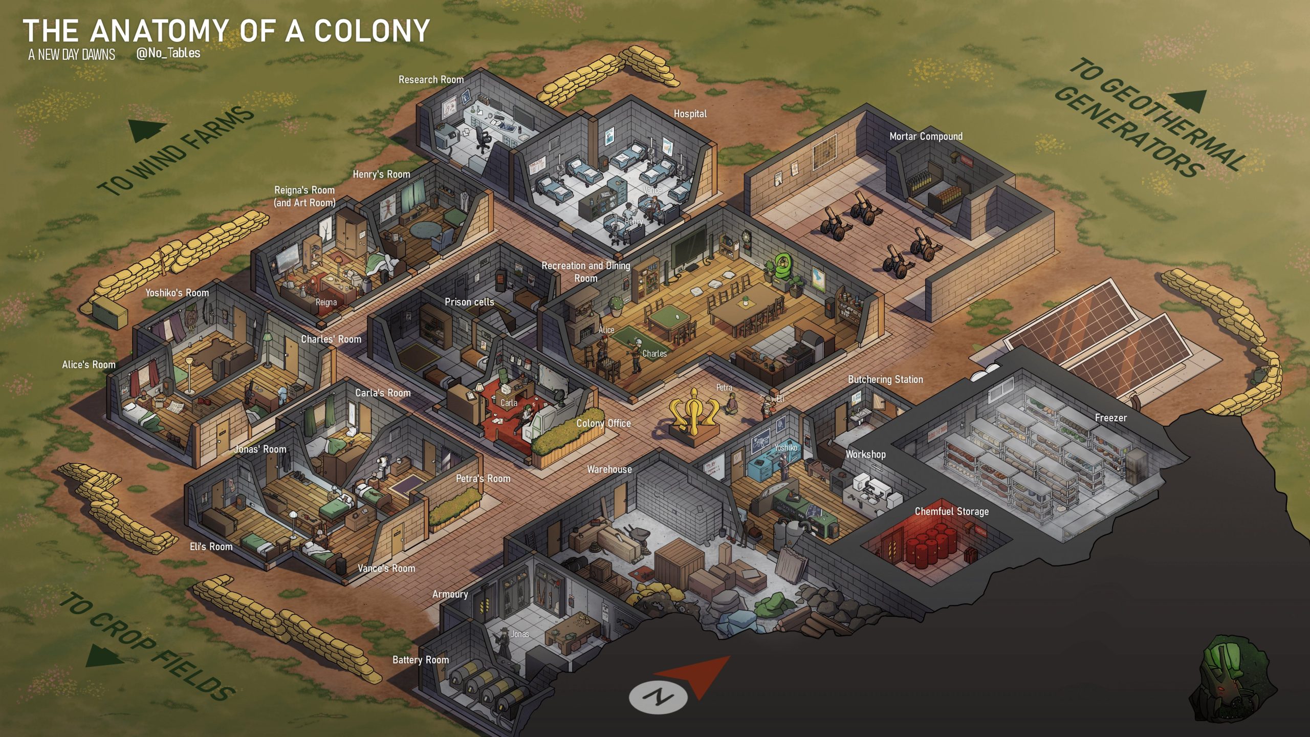Для начала постройте самые необходимые помещения: мастерскую, кухню, столовую, спальни, склады и поля.