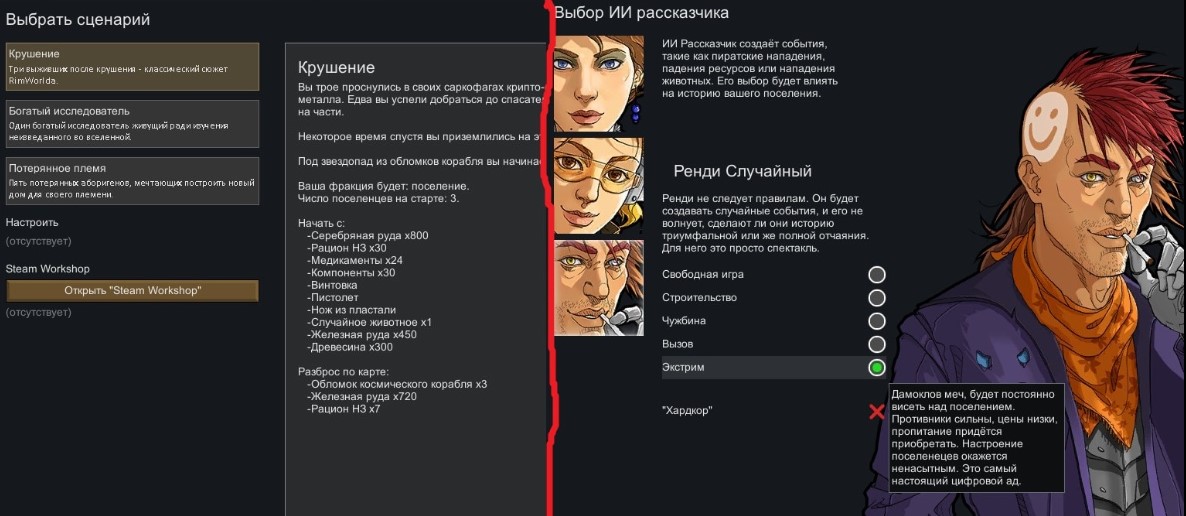 Кроме выбора сценария вам также предстоит решить, кто будет вашим рассказчиком. Зачастую именно рассказчики будут определять, какие события станут происходить с вашими колонистами. К стандартным рассказчикам относят троих: