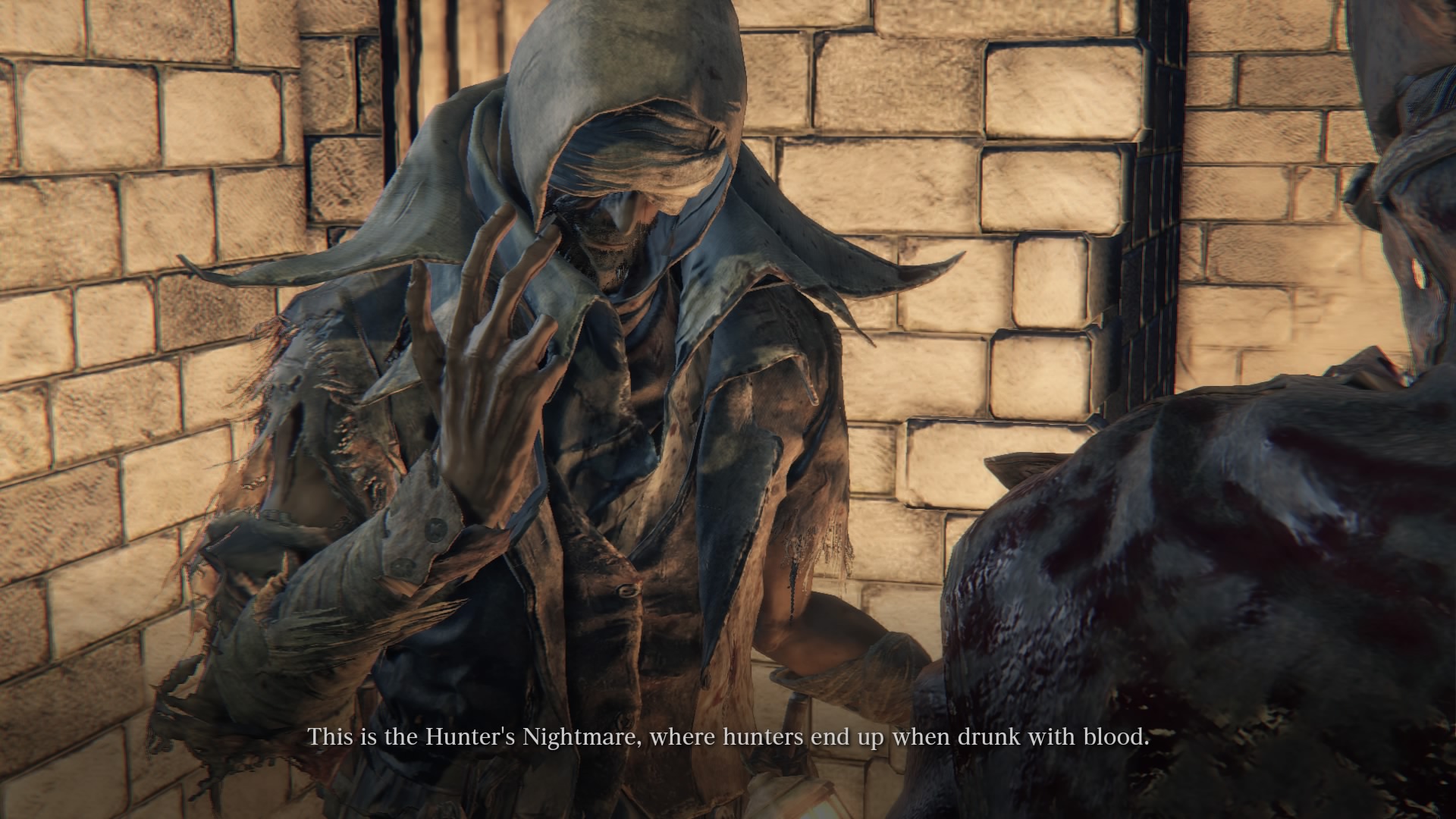 Первая встреча с Саймоном состоится в Кошмаре Охотника неподалеку от первого фонаря. Для знакомства с этим персонажем на развилке поверните налево и поднимитесь на мост. Здесь нырните в проход и поговорите со скрывающимся в тени Саймоном.
