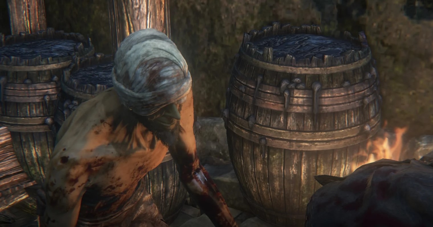 Чтобы добраться до Подозрительного нищего потребуется от первого фонаря Запретного леса пройти через деревушку и водоем, затем проскочить мимо пушки и зайти в мельницу. В одном из проемов внутри здания отыщите козырек и с него спрыгните вниз. Дальше дорога приведет вас прямо к Нищему, ждущему игрока в окружении трупов.