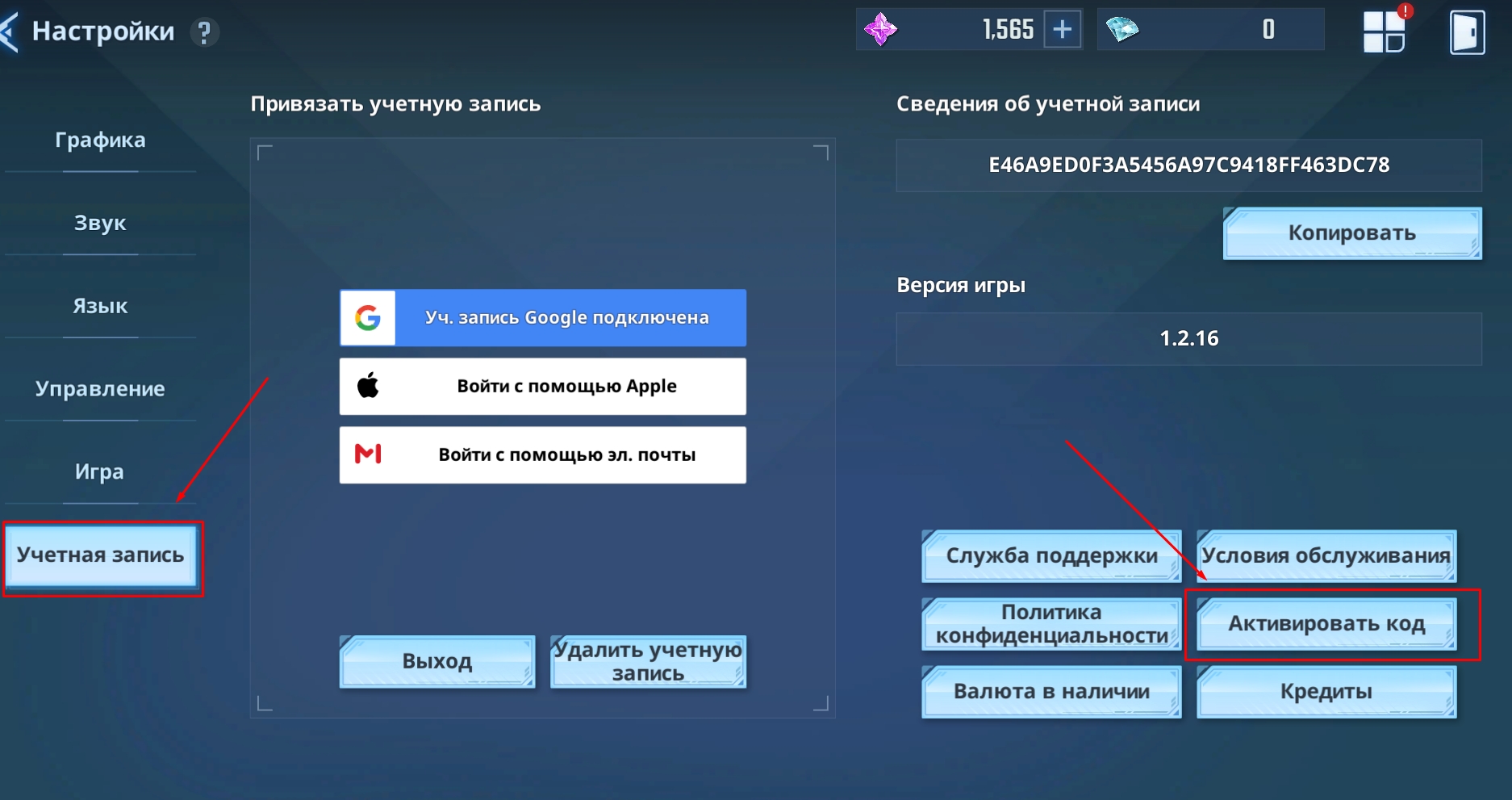 Обратите внимание! Если у вас нет возможности войти в игру, чтобы активировать промокод, можете сделать это на официальном сайте. В таком случае достаточно знать свой идентификатор участника. Посмотреть его можно в настройках -> «Учетная запись» в строке «Сведения об учетной записи». Если вы знаете его, перейдите по этой ссылке на страницу активации подарочных кодов и заполните все поля: