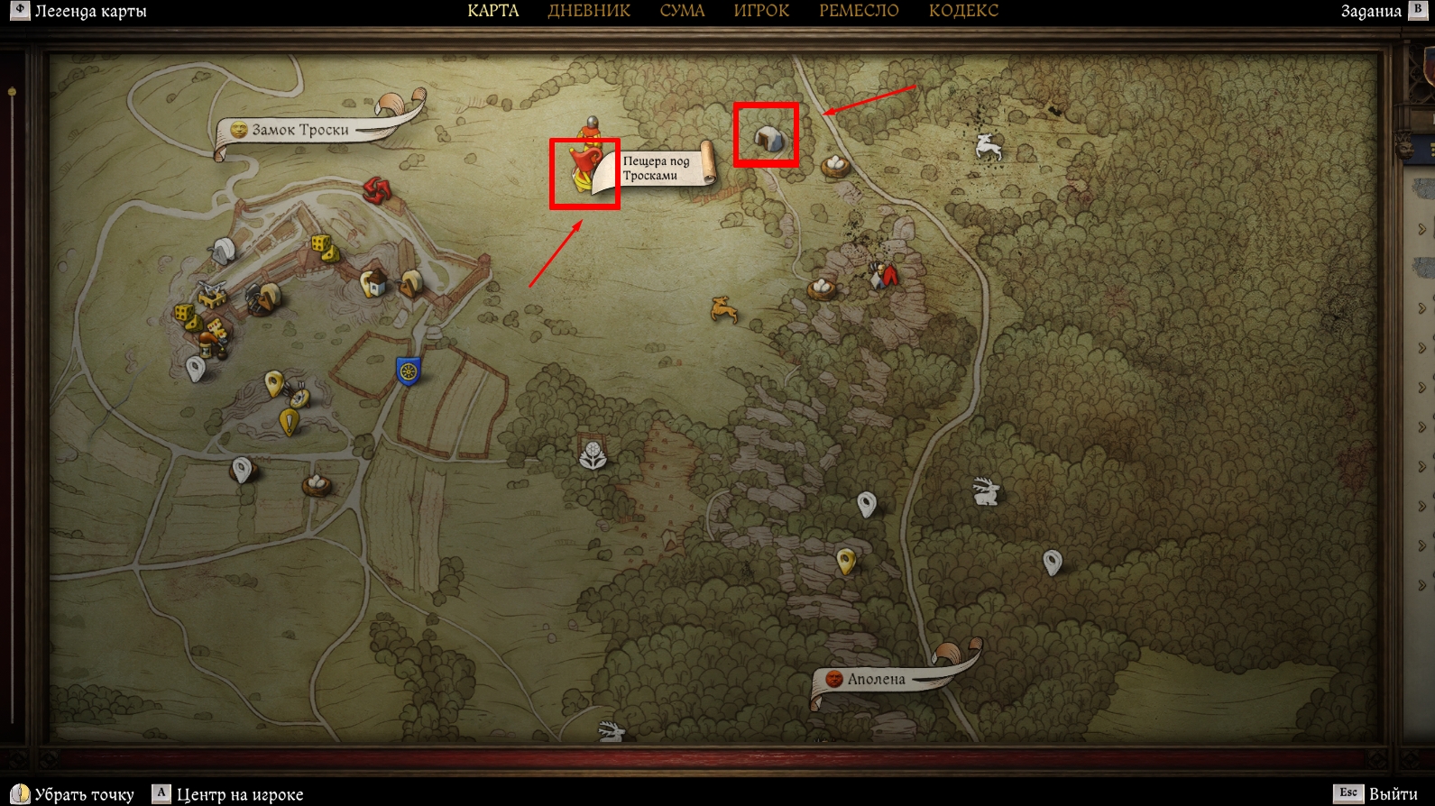 - Лежит под Тросками в мешке. Попасть в подземные туннели можно через вход в пещеры на севере от Аполены
