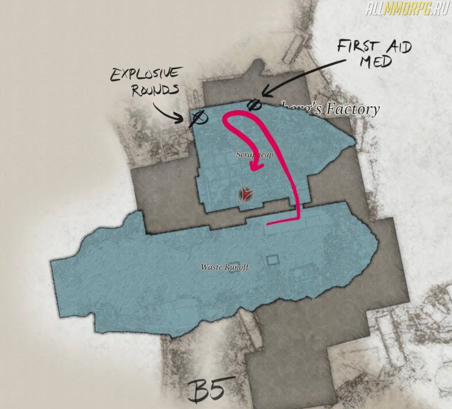 В ходе кат-сцены разозлившийся Гейзенберг скинет Итана в сток с отходами. Придя в себя, сверните направо и найдите решетку в стене. Пройдите сквозь отверстие на свалку фабрики.