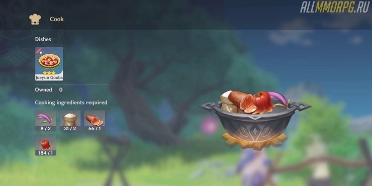 Заоблачный гоба – блюдо, которое дает серьезную прибавку к характеристикам персонажа. Эта еда увеличивает физический урон на 30%. Эффект длится 5 минут. Рецепт на приготовление заоблачного гобы подается у мисс Бай всего за 5 тысяч моры. НПС можно найти в регионе Ли Юэ, деревня Цинцэ. Торговка стоит рядом с водяной мельницей. В состав блюда входит 1 ветчина, 2 муки, 1 заоблачный перчик и 2 конских хвоста.
