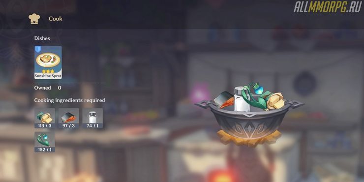 Рецепт на приготовление солнечной рыбы можно получить у Альбедо во время прохождения квестов Главы 1 Задания легенд Меловой Принцепс. Это блюдо подходит для отрядов, в котором есть герои, использующие щит, например Чжун Ли или Синь Янь. Солнечная рыба увеличит прочность щита максимум на 30% (зависит от качества блюда). Эффект длится 5 минут. В список ингредиентов блюда входит 3 рыбы, 3 сливочного масла, 1 соль и 1 трава-светяшка.
