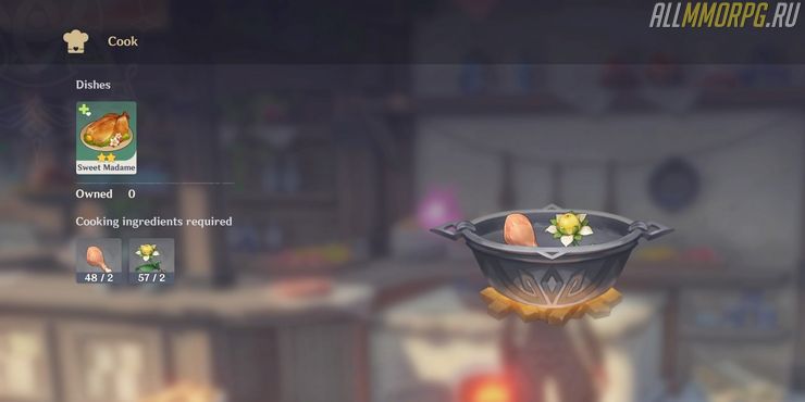 Помимо мондштадтских оладушек в игре есть еще одно блюдо, которое восполняет много ХП и не требует каких-либо особых ингредиентов. Это цыпленок в медовом соусе! Он мгновенно восстанавливает 22% запаса здоровья и лечит героя дополнительно на 1200 ХП. Конечно, эффект у него слабее, чем у мондштадтских оладушек, но приготовить его намного проще. Все, что нужно для цыпленка в медовом соусе – 2 мяса птицы и 2 цветка-сахарка.