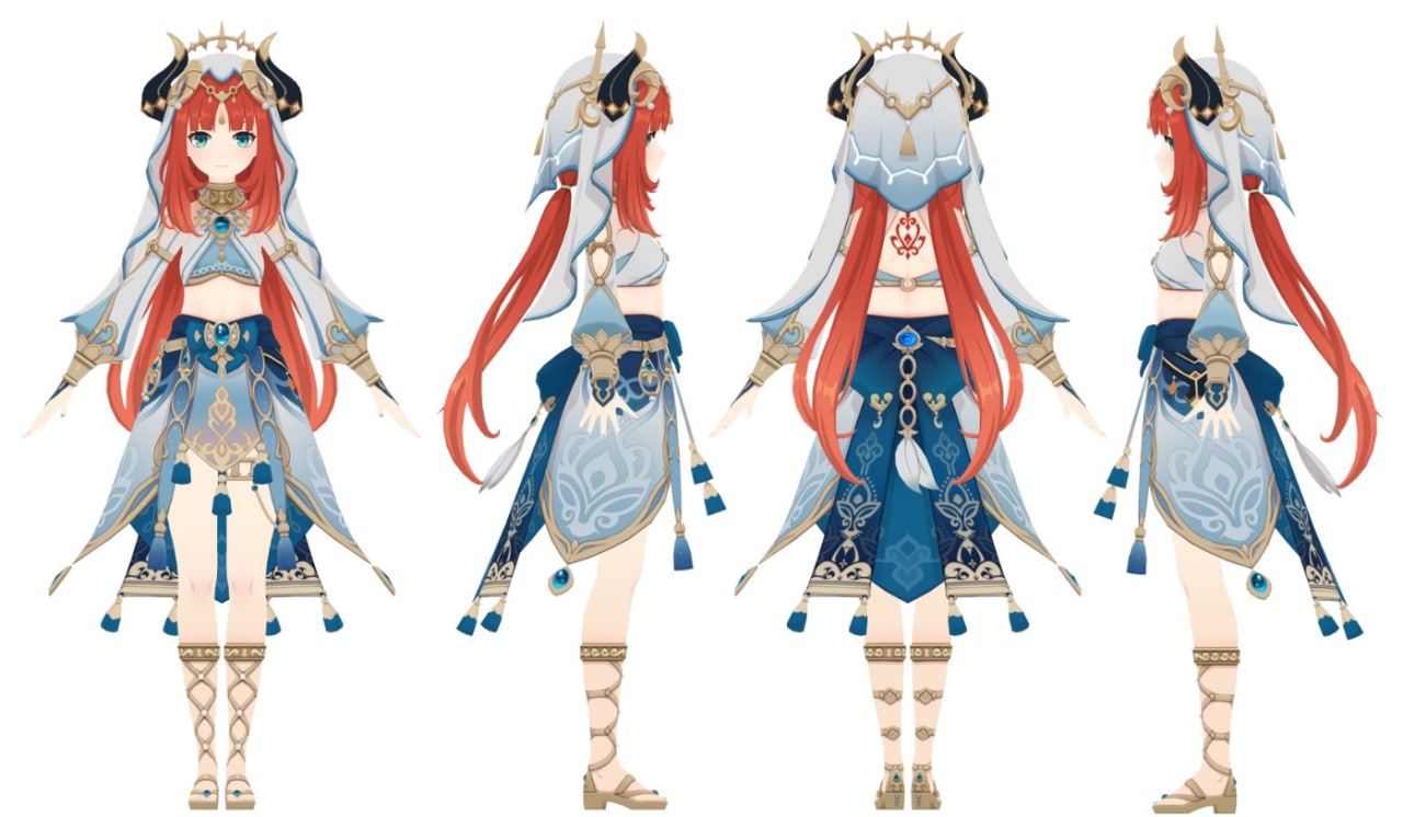 - Нилоу. Нилоу – прекрасная девушка с очаровательными рожками, которые по форме похожи на рога Аждахи и отличаются от них только цветом. Она носит белую вуаль, меч и глаз бога стихии Гидро. Предположительно, она будет целителем.