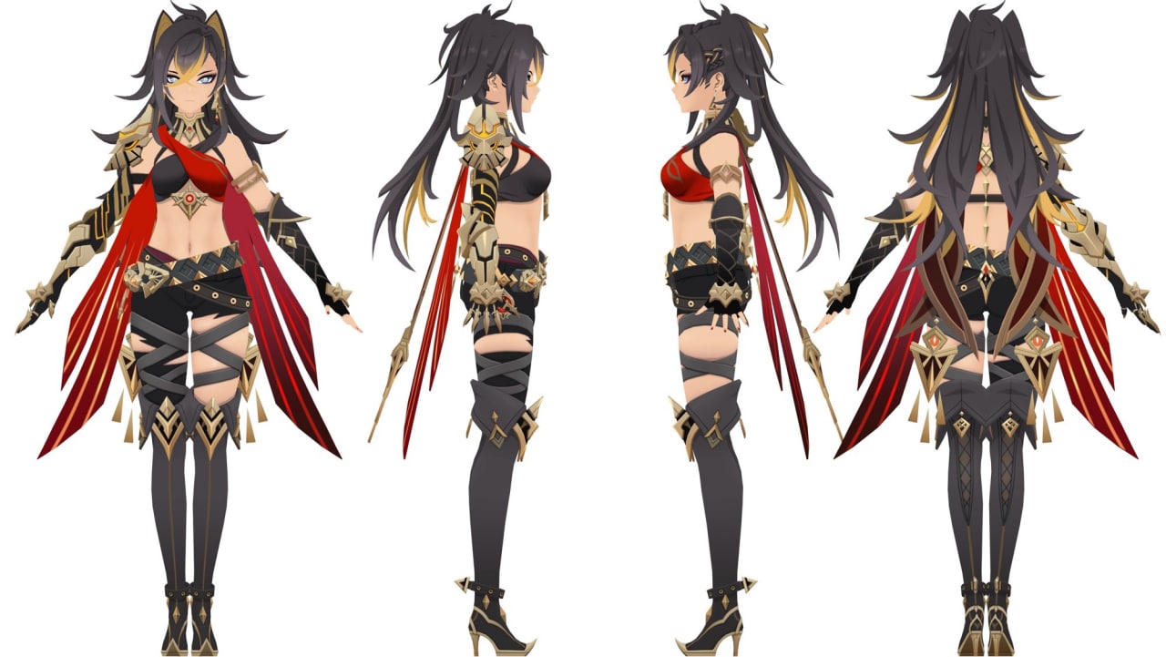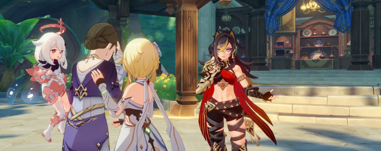 - Дехья. Девушка с темной кожей и кошачьими ушками, которая одета в наряд, похожий на одежды Клеопатры. Она носит двуручный меч и обладает глазом бога стихии Пиро.