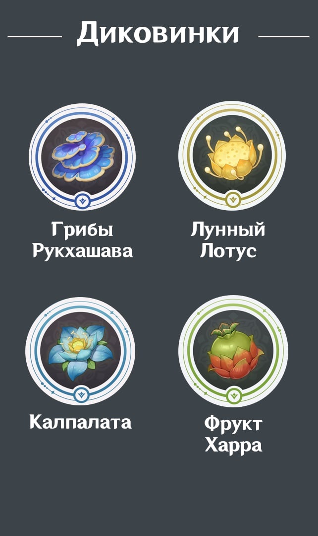 - Грибы Рукхашава. Слоистые грибы, которые растут на деревьях в глубине тропического леса. Вероятнее всего, их можно будет найти только в пределах локации Лес мирового сохранения.