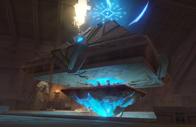 Итак, чтобы войти в руины, нужно решить мини-головоломку с рунным механизмом и песчаными насыпями. Рунный механизм излучает энергию, которая способна рассеивать кучи песка. Чтобы открыть ворота храма, ударьте по рунному механизму обычной атакой любого героя трижды. Луч, исходящий из устройства, должен повернуться в сторону куба, присыпанного песком, и очистить его. После этого взаимодействуйте с кубом для открытия ворот.