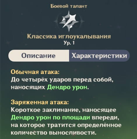 При использовании навыка «Классика иглоукалывания» герой 4 раза атакует врагов перед собой, нанося им урон от Дендро. Заряженная атака тратит определенный процент выносливости и позволяет нанести элементальный АОЕ урон.