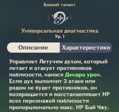 Применив способность «Универсальная диагностика», Бай Чжу призывает Летучего духа, который атакует противников поблизости и наносит им Дендро урон. Если Летучий дух выполнит три атаки или рядом не будет монстров, он вернется и подлечит ближайших союзников. Сила его лечения зависит от максимального запаса здоровья Бай Чжу.