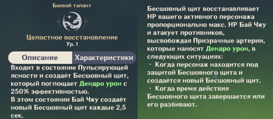 Активация умения «Целостное восстановление» создает Бесшовный щит, поглощающий Дендро урон с 250% эффективностью. Дополнительно герой входит в состояние Пульсирующей ясности. Пока оно длится, Бай Чжу создает новый Бесшовный щит каждые 2,5 секунды.