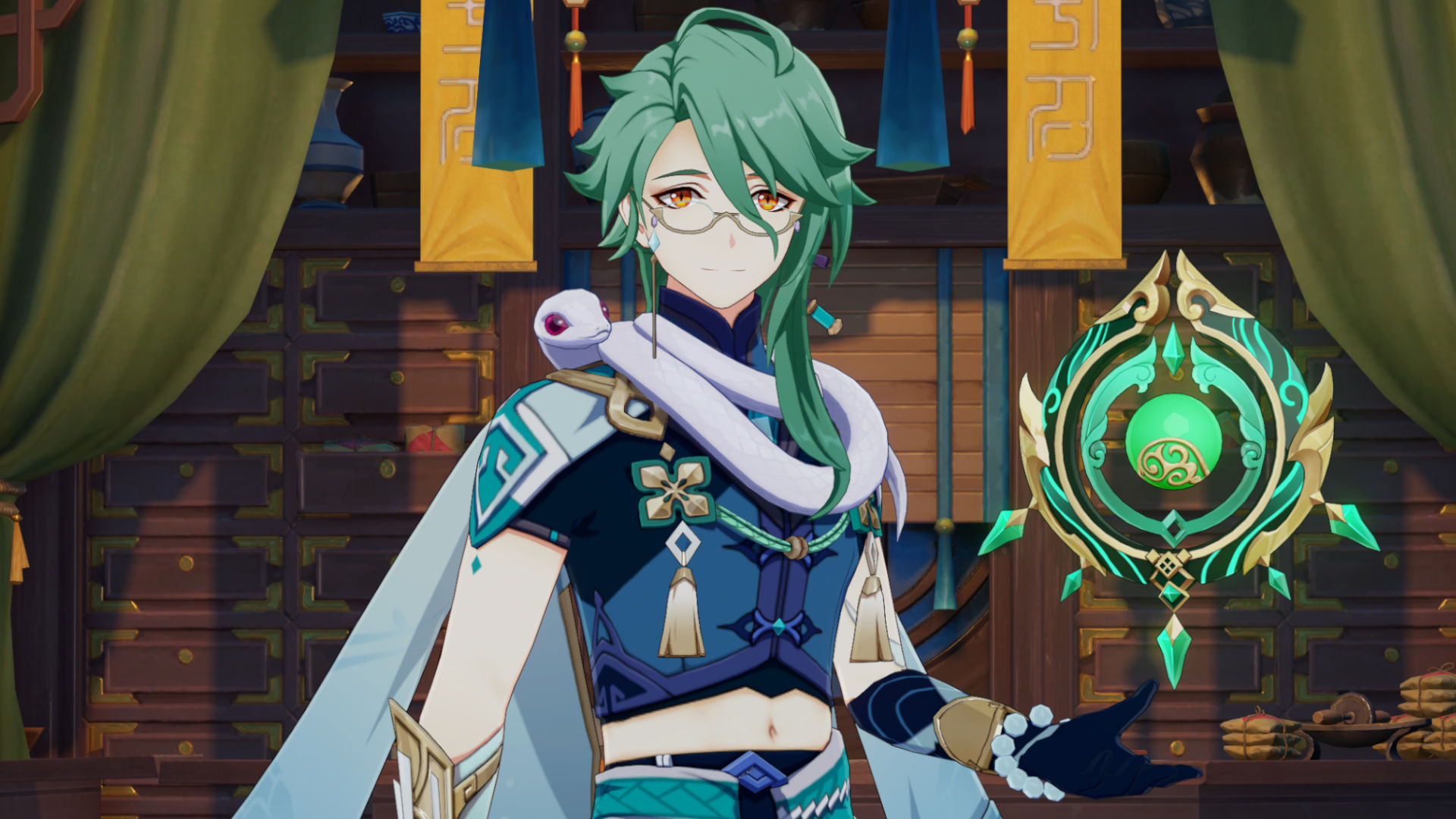 Бай Чжу – герой с элементом Дендро Владелец хижины «Бубу» в Ли Юэ. На его плечах всегда возлежит белая змея по имени Чан Шэн. Искусный лекарь со своими скрытыми намерениями. |