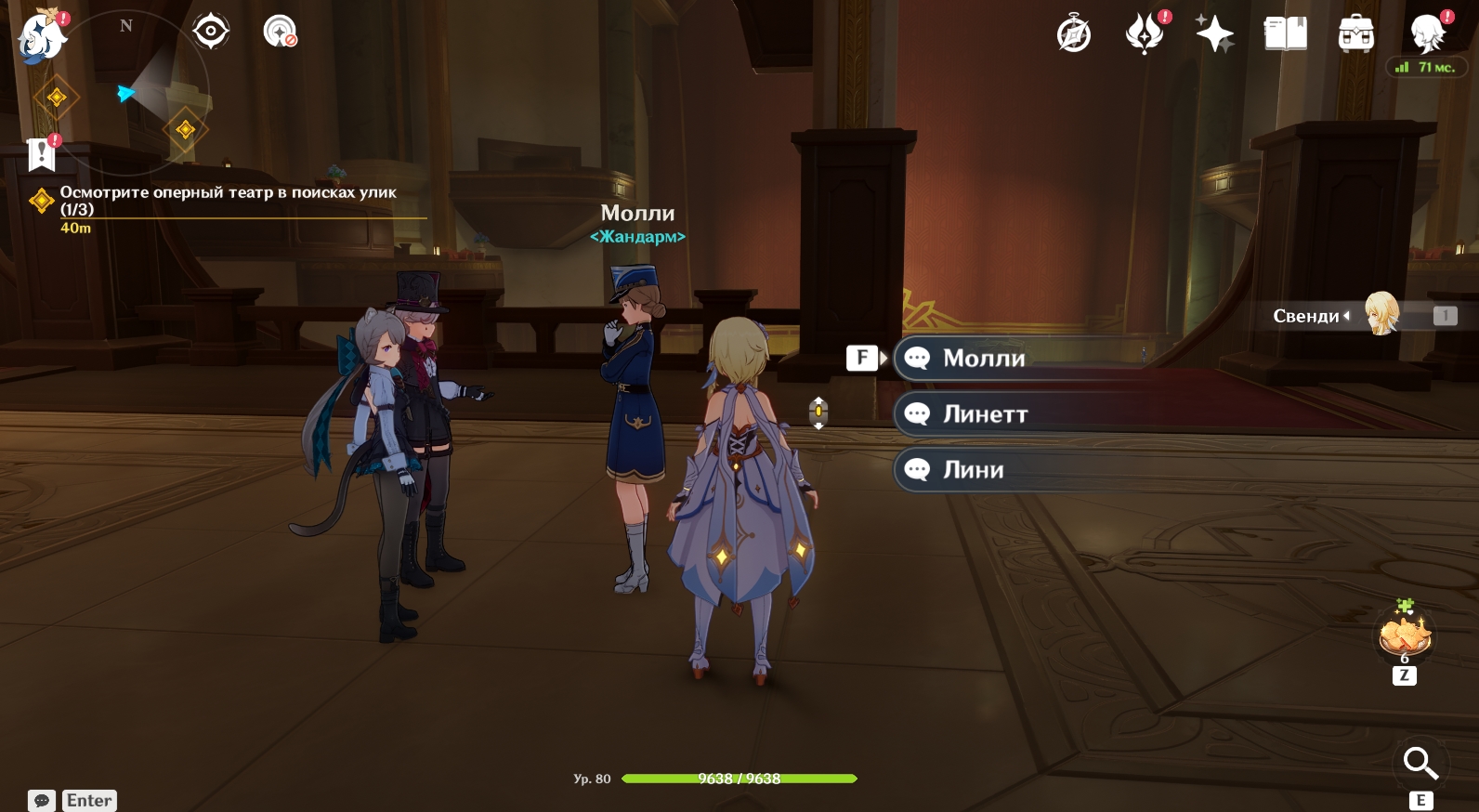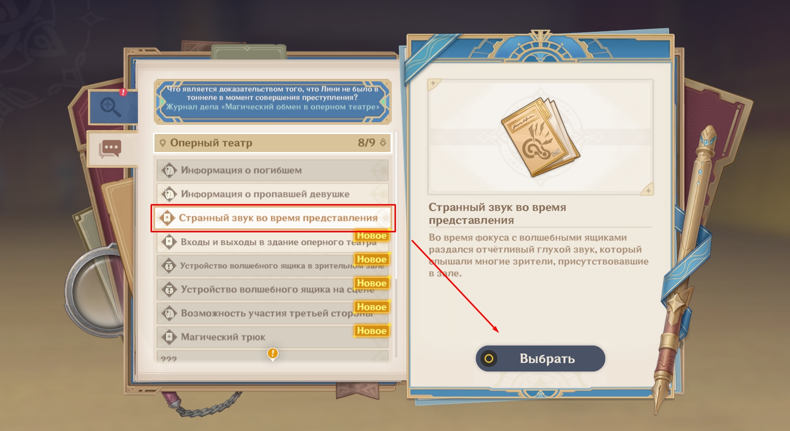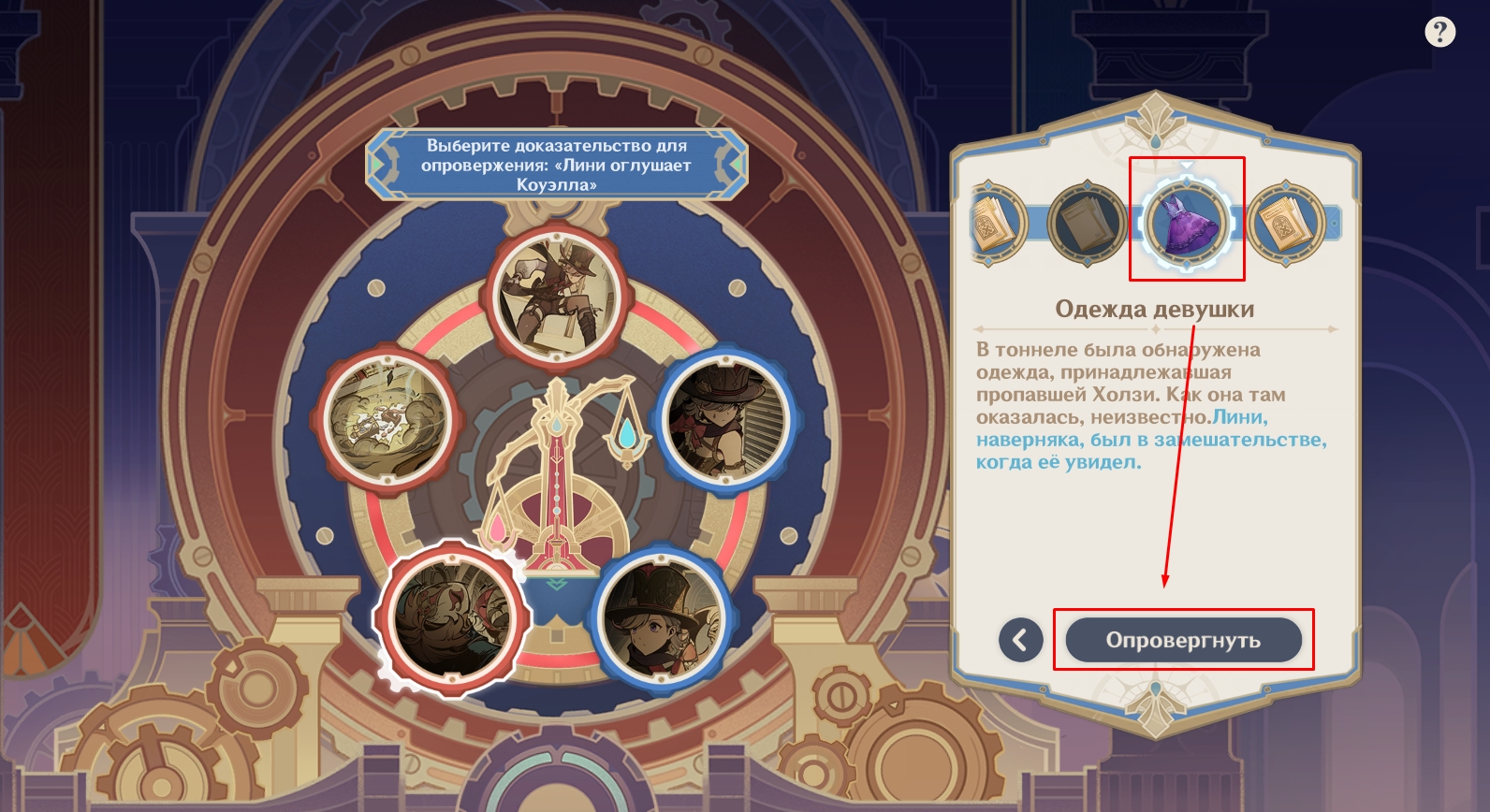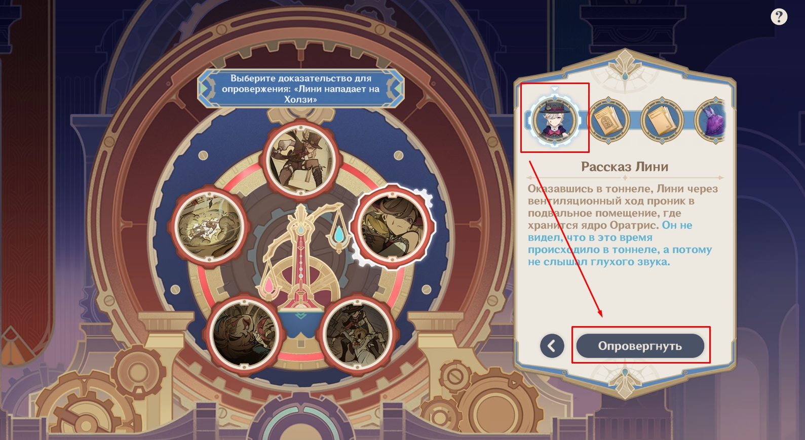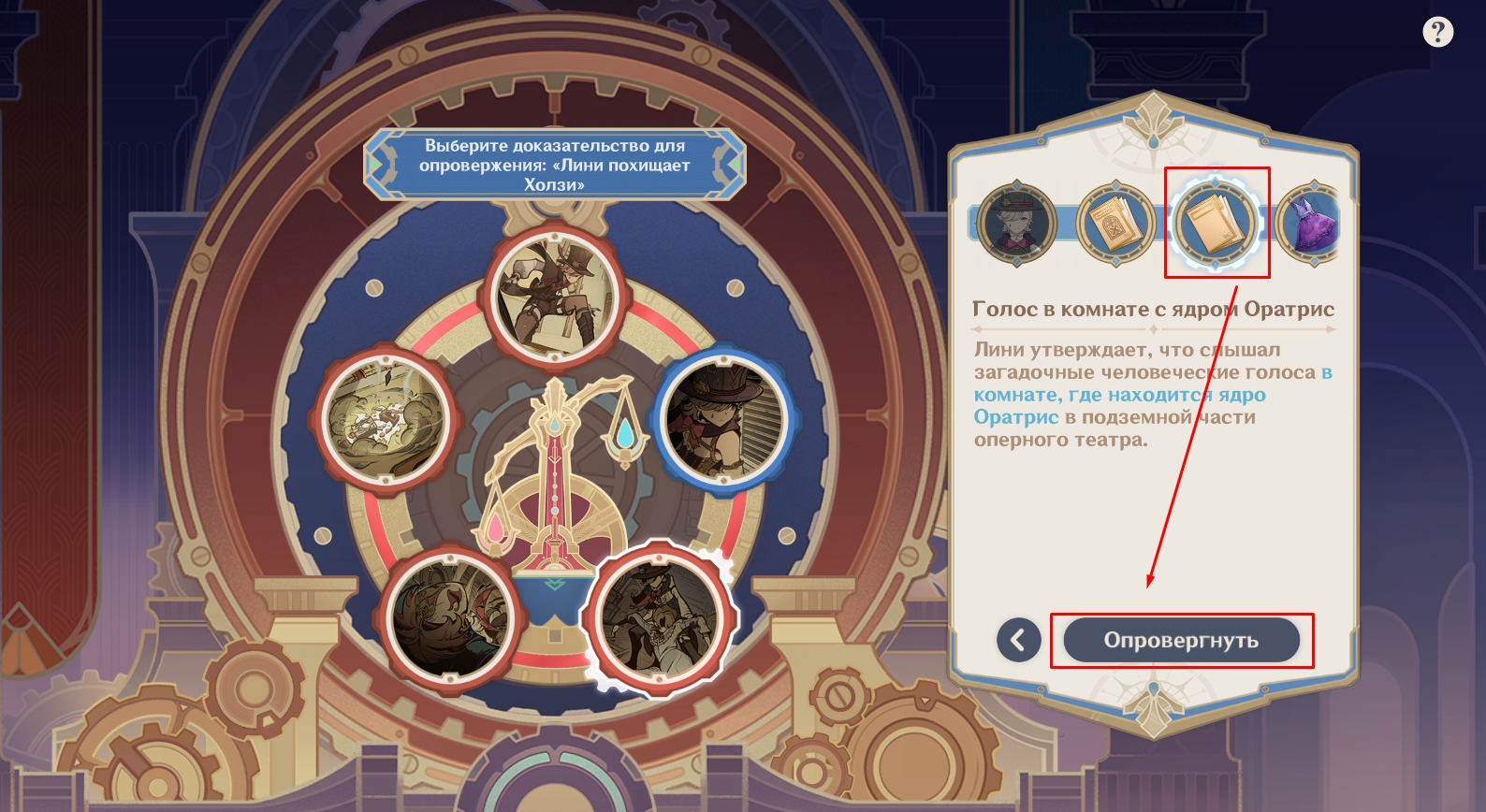 Спуститесь на нижний ярус зала и подойдите к квестовому маркеру, чтобы принять участие в судебном заседании. На моменте допроса, когда вы узнаете, что Лини и Линетт являются Фатуи, нажимайте любую диалоговую строчку. Ваш выбор не повлияет на ход событий. У вас будет шанс уйти на перерыв и заставить Лини рассказать всю правду. После перерыва вернитесь в главный зал театра.