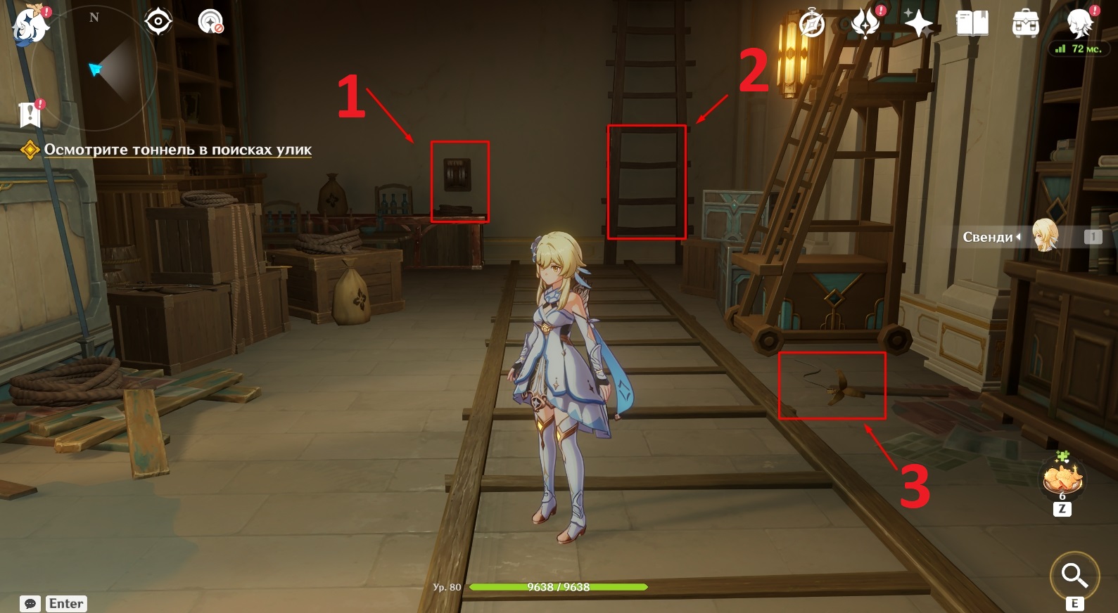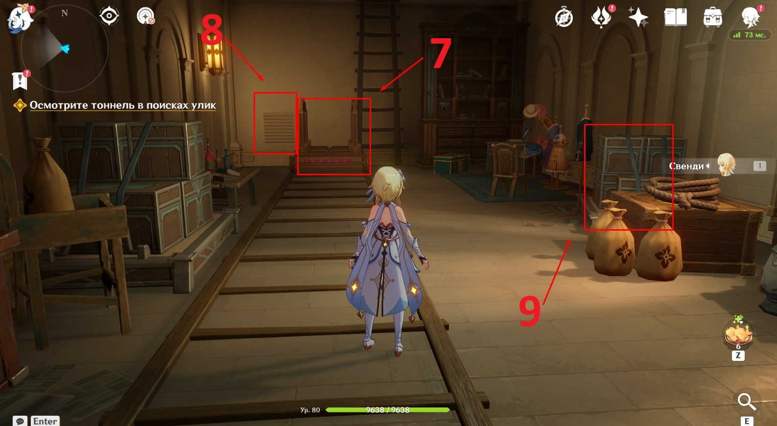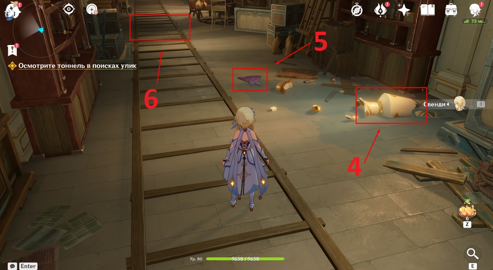 Соберите три цветка Ромарин и поговорите с Лини еще раз. Он скажет, что настало время посетить Кур-де-Фонтейн, столицу региона. Однако покинуть порт у вас пока не получится: Лини увидел девушку-воришку. Вам нужно помочь поймать ее. Используйте лифт, чтобы подняться на верхний уровень порта.