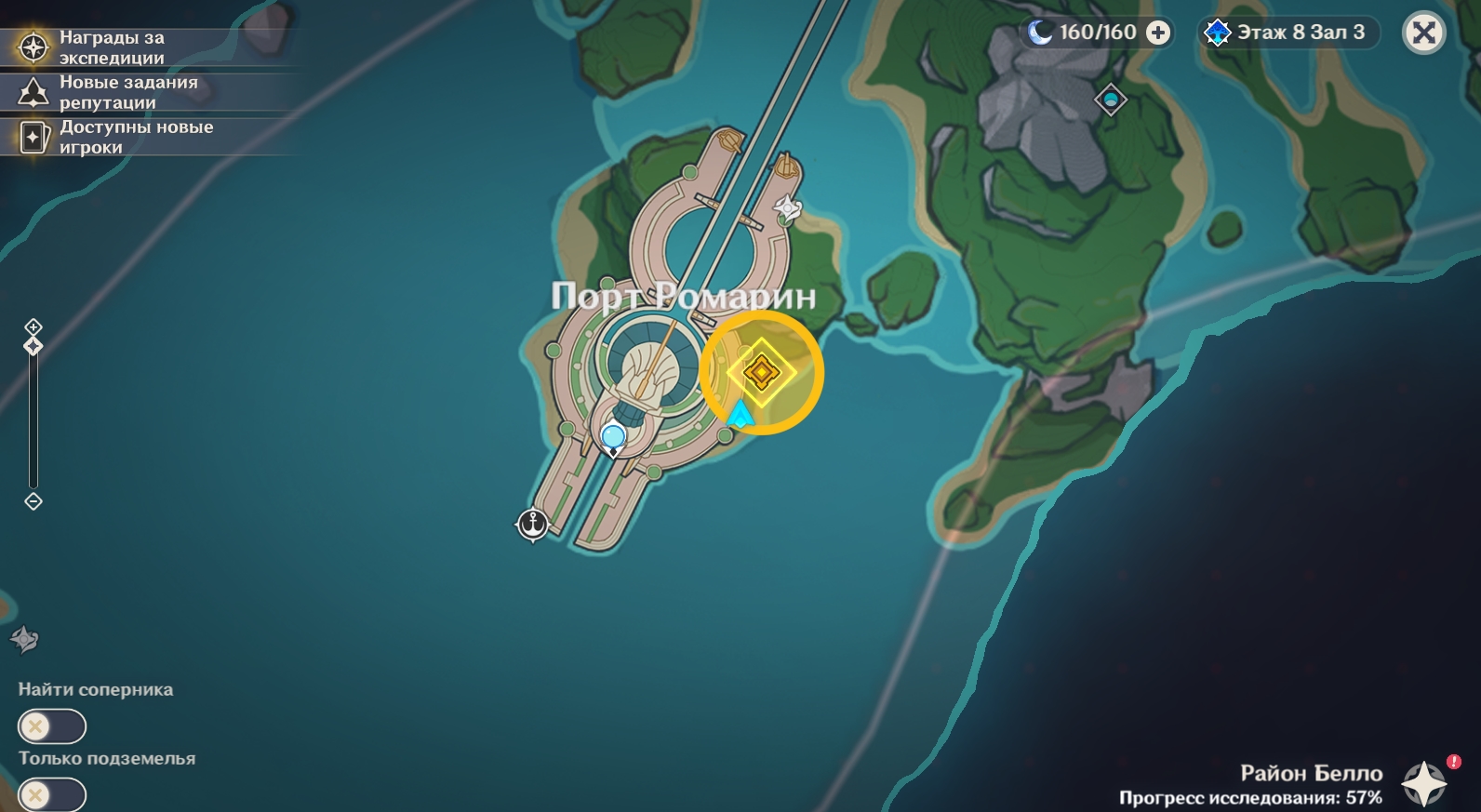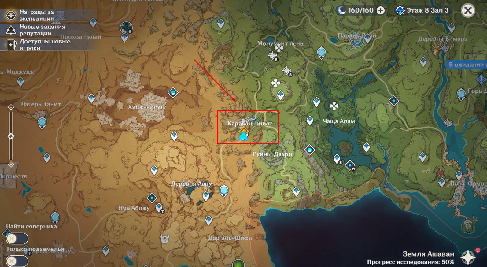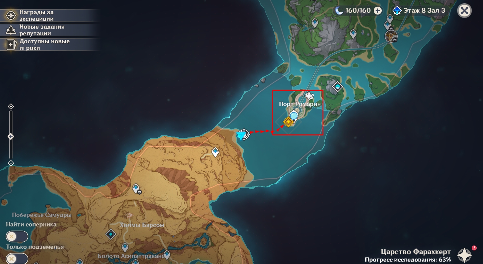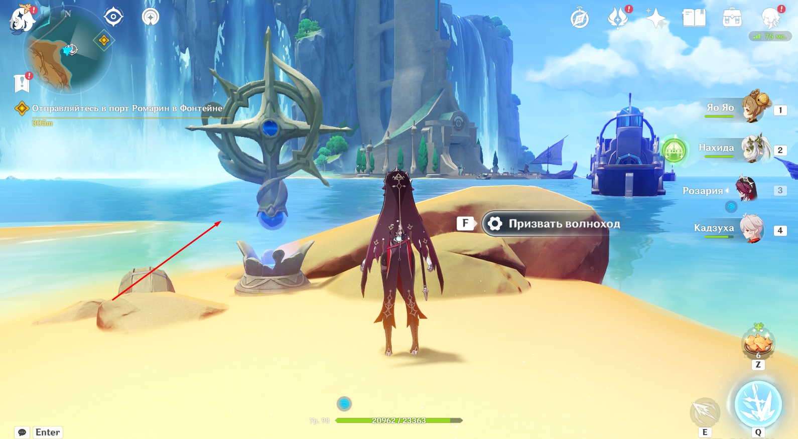 После прощания с Дэхьей Путешественница покинет Сумеру и окажется рядом с побережьем на севере Царства Фарахкерт. Спрыгните вниз и активируйте возле воды точку призыва волнохода, после чего призовите кораблик и доплывите на нем до Порта Ромарин.