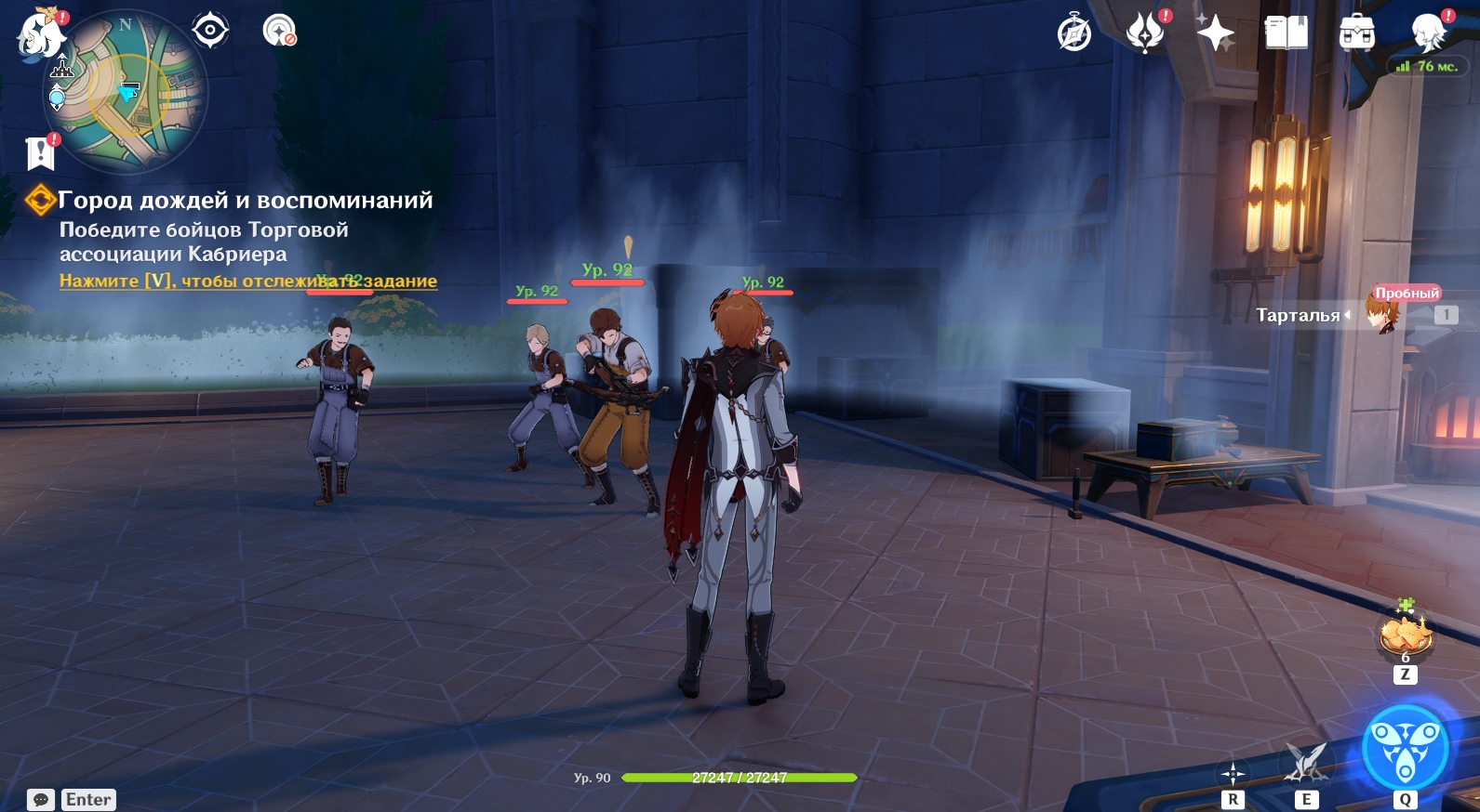 Играя за Чайльда, победите надоедливых бойцов Торговой ассоциации и посмотрите кат-сцену. После боя Тарталья потеряет свои гидро-способности по неизвестной причине. В конце диалога он отдаст Путешественнице свой Глаз Бога и уйдет.