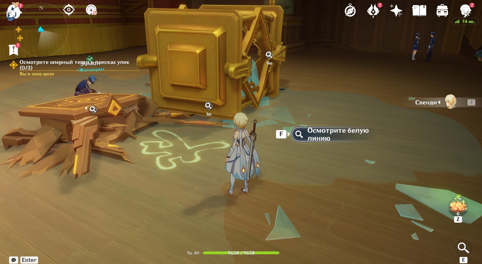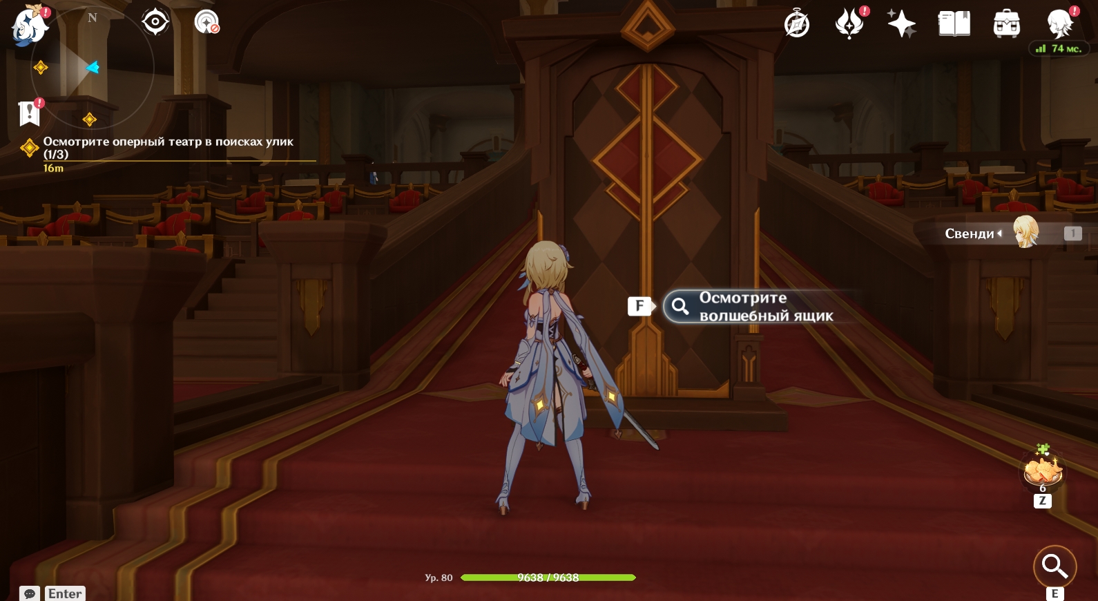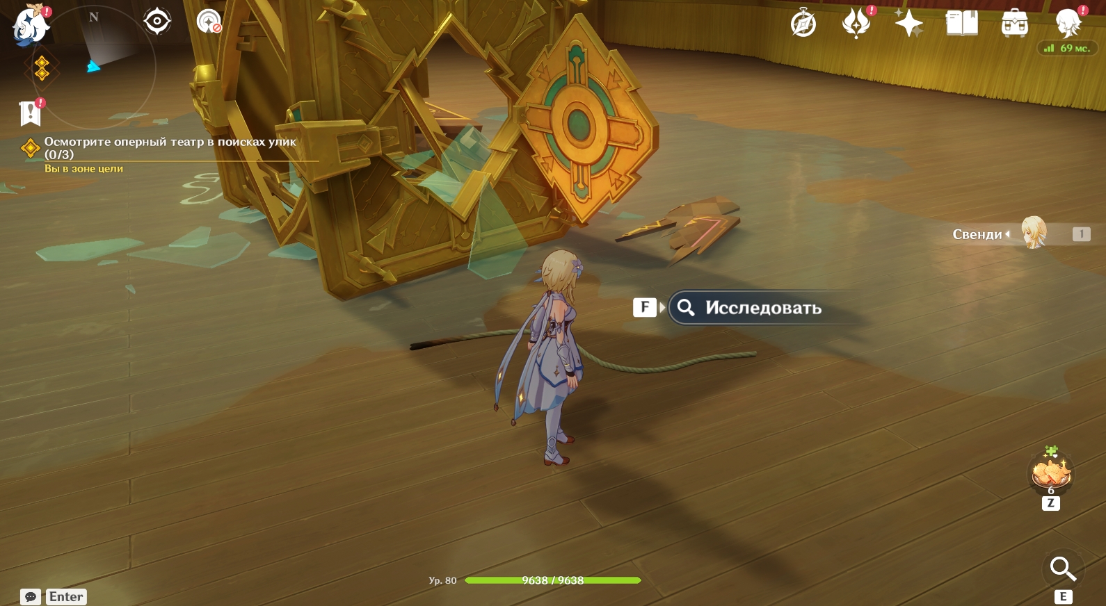 Первая цель задания «Тени лжи под светом софитов» - найти улики. Используйте способность Путешественницы, чтобы обнаружить ключевые места в главном зале театра. Вам необходимо: