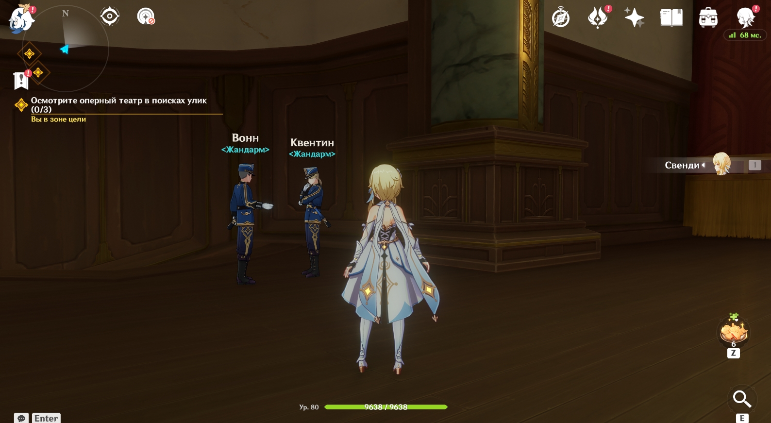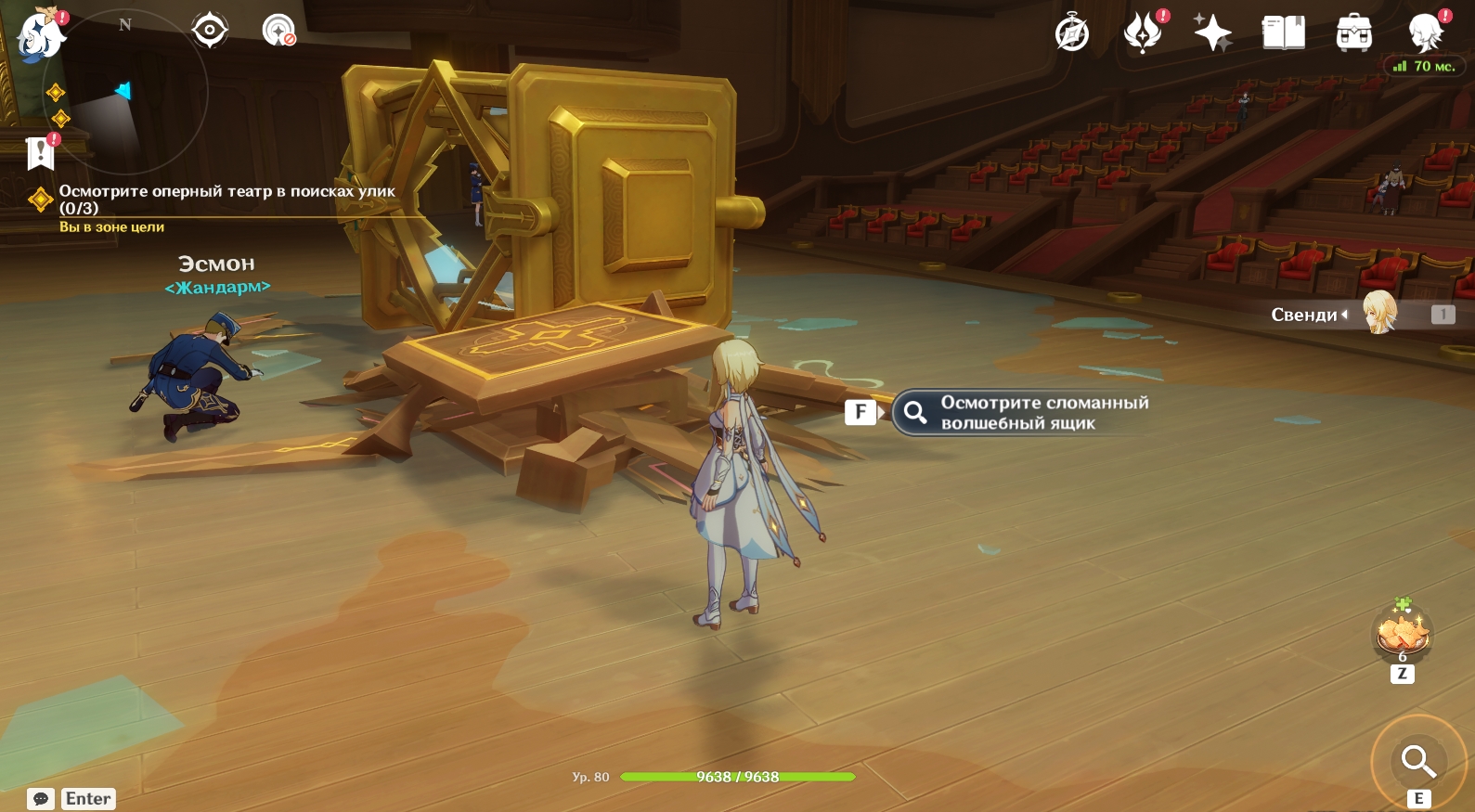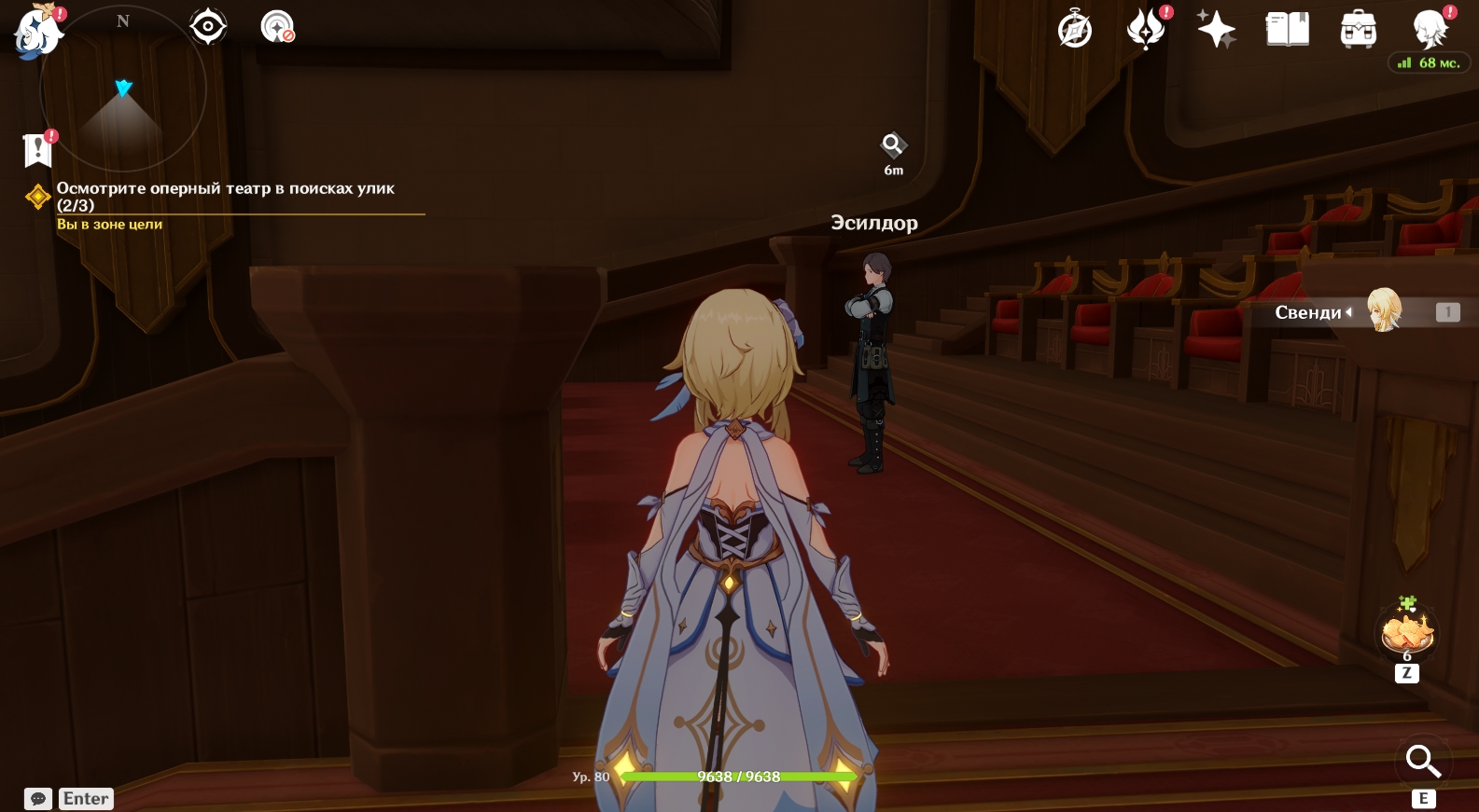 Первая цель задания «Тени лжи под светом софитов» - найти улики. Используйте способность Путешественницы, чтобы обнаружить ключевые места в главном зале театра. Вам необходимо: