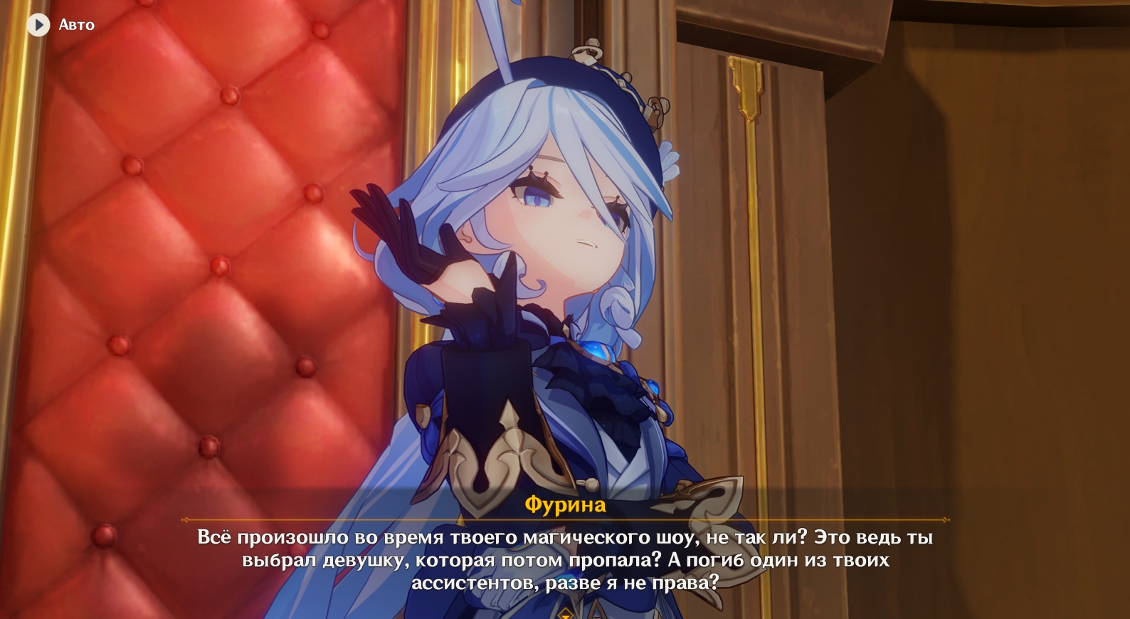 После короткой беседы с верховным судьей Фонтейна начнется выступление Лини и его сестры, но оно, к сожалению, закончится гибелью одного из работников сцены, а также пропажей зрительницы, принимавшей участие в магическом фокусе. Невилетт и Фурина посчитают, что Лини – тот самый серийный похититель девушек, о котором рассказывала нам Шарлотта из «Паровой птицы».