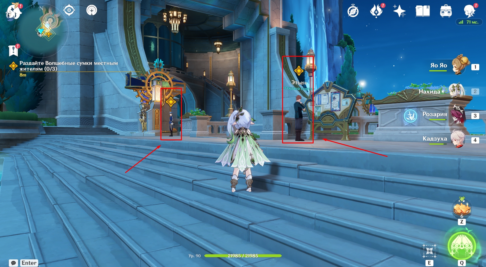 После ухода Фурины Лини расскажет немного о местном пророчестве и попросит передать трем местным жителям Волшебные сумки. Все три НПС находятся на первом уровне порта Ромарин. Их зовут Ожеро, Этьен и Галатея.