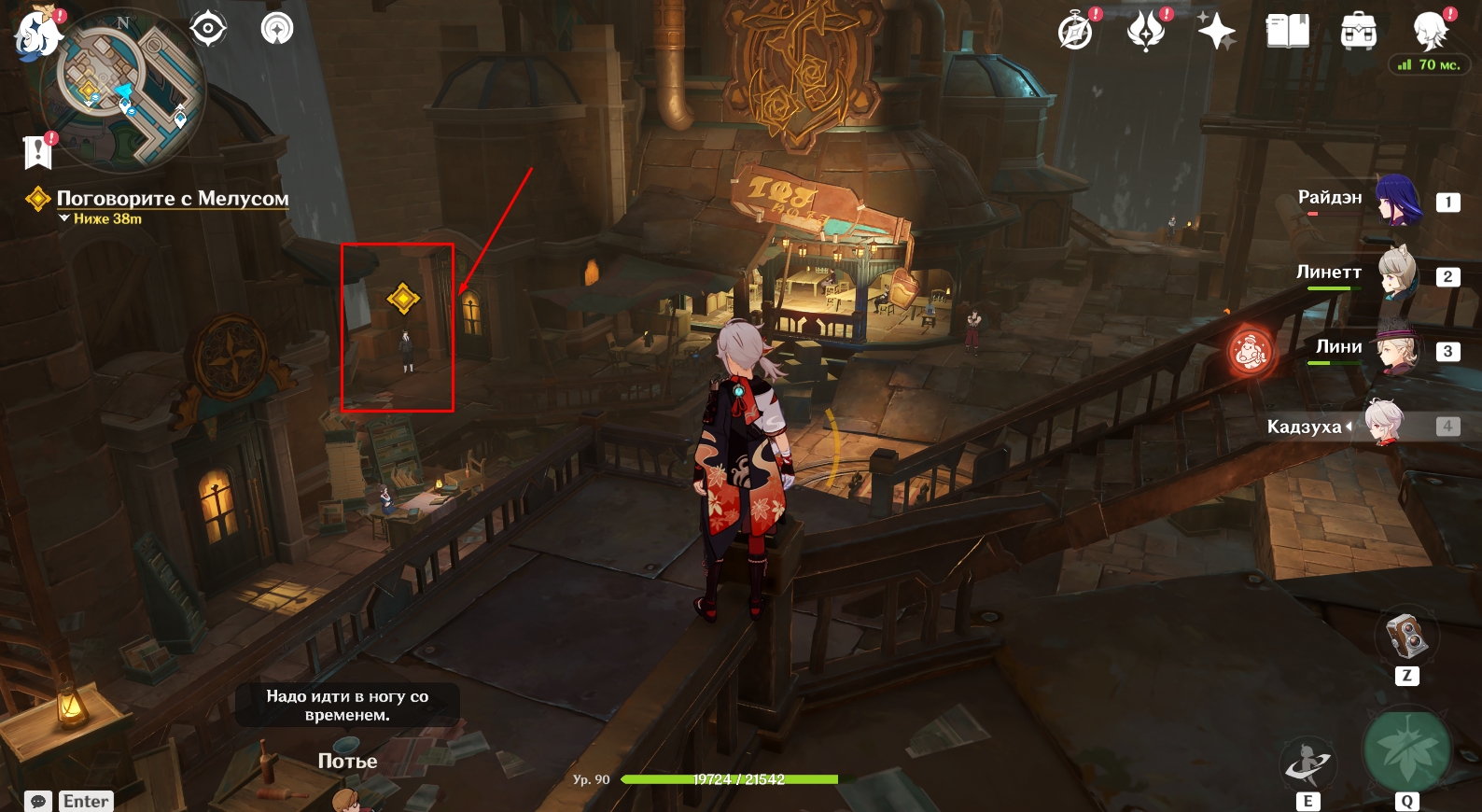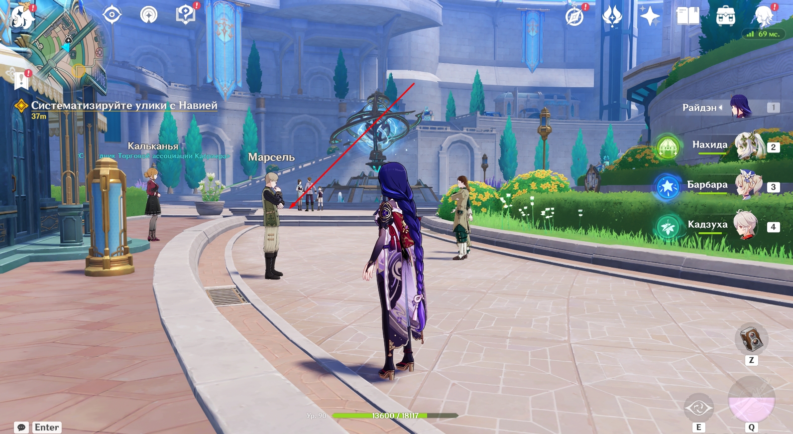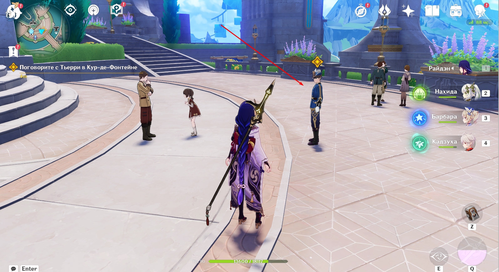 Следующий шаг – возвращение в Кур-де-Фонтейн. Телепортируйтесь к местной статуе Семи Архонтов и побеседуйте с Тьери, стоящим неподалеку от нее.