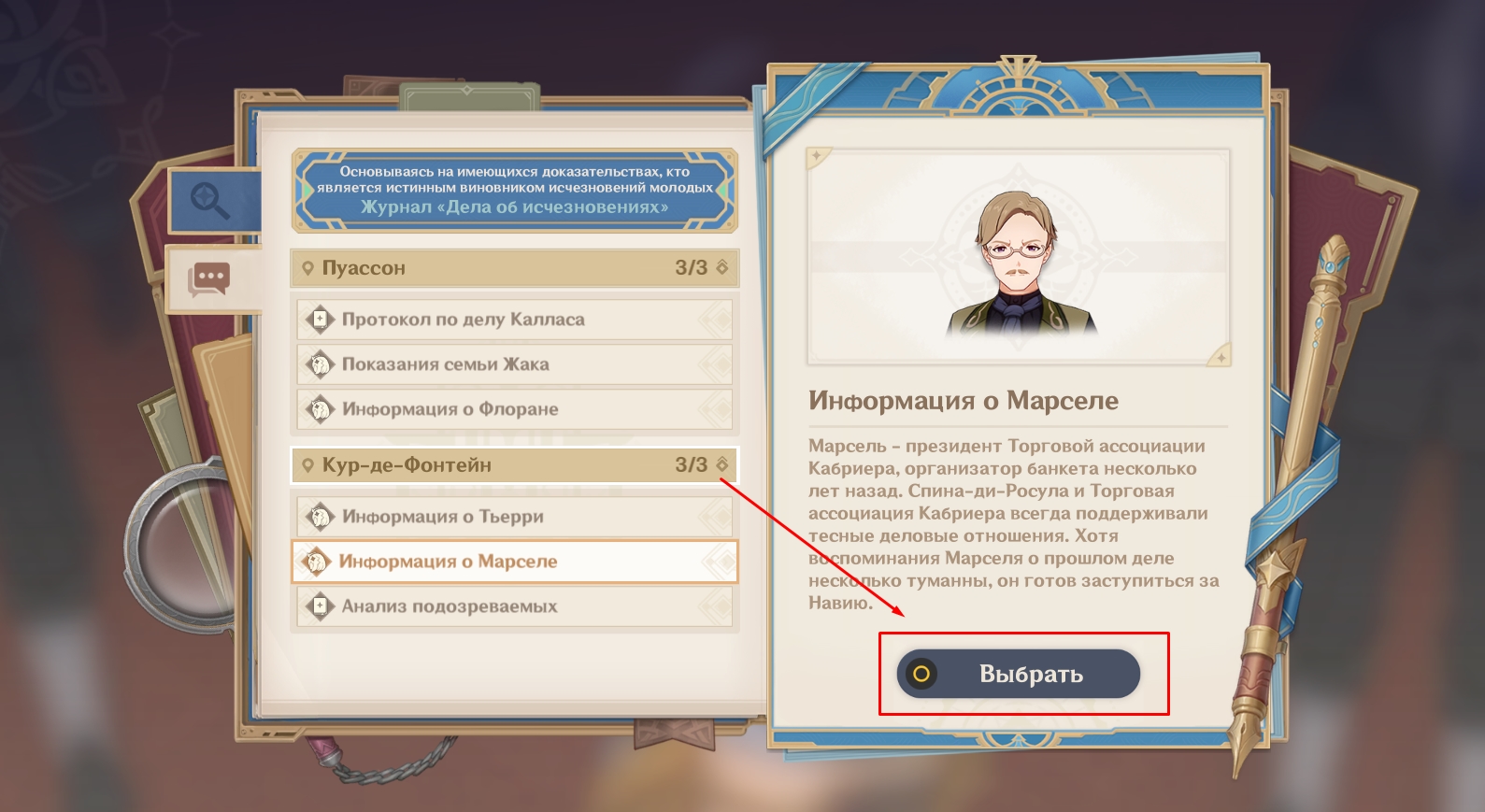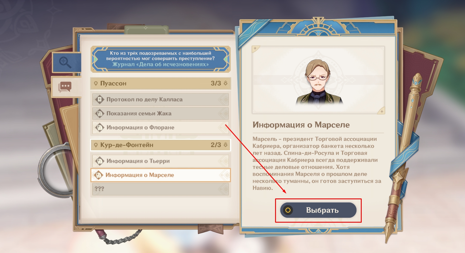 Но перед тем, как вы войдете внутрь, посмотрите, что происходит в суде, где сейчас находится Тарталья. От лица Навии назовите имя подозреваемого (Марсель). Ваш выбор запустит мини-игру, аналогичную той, в которую вы играли во время прошлого судебного разбирательства.