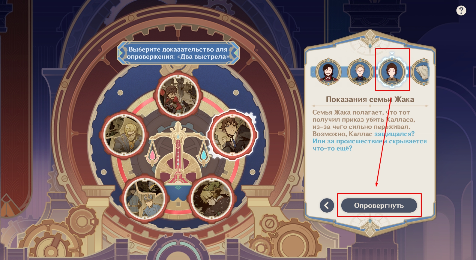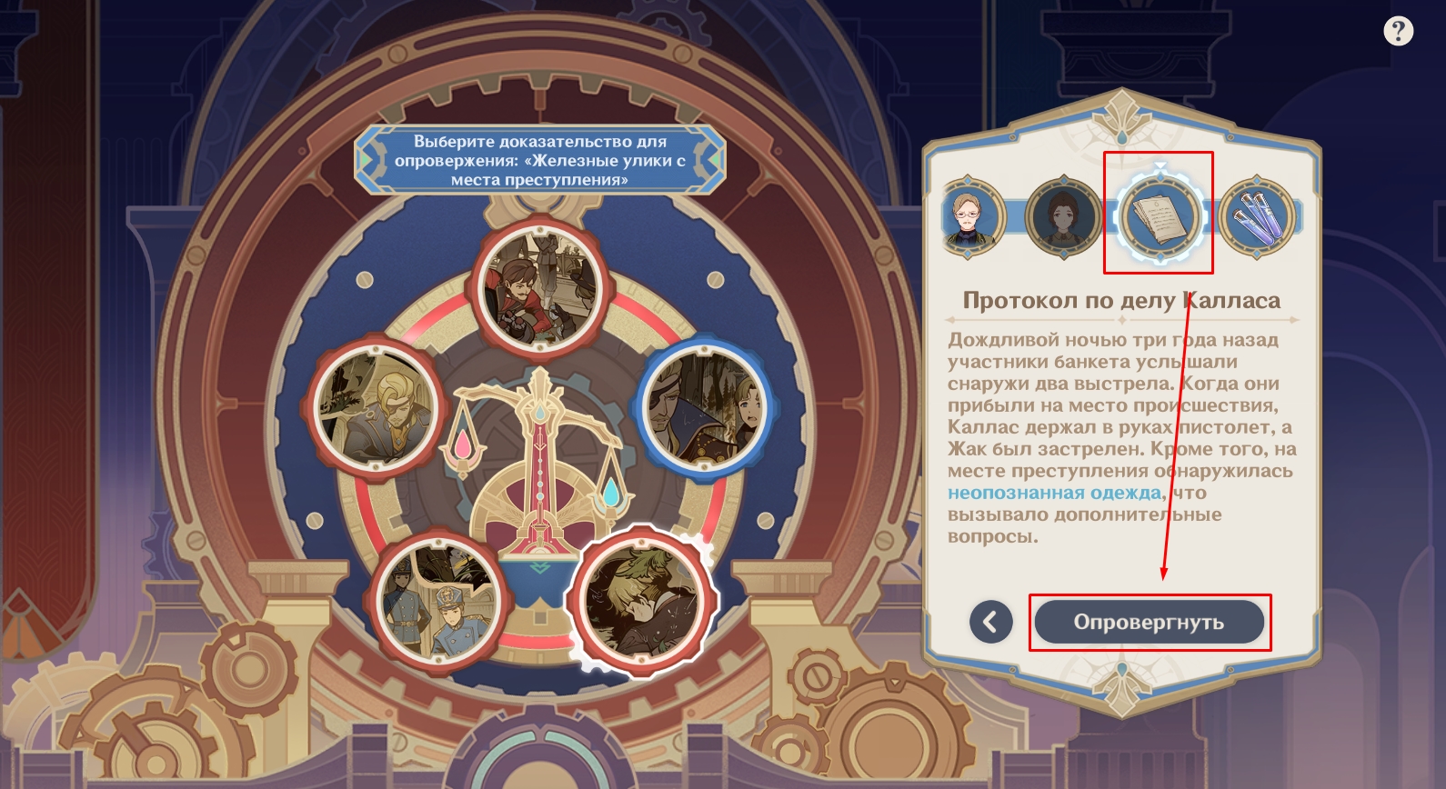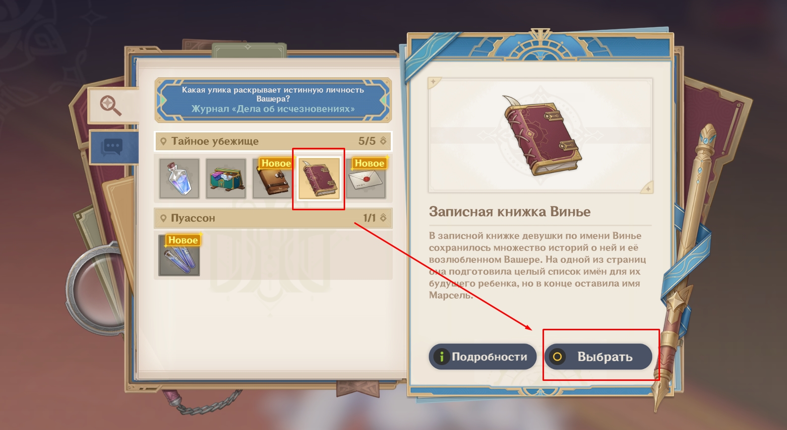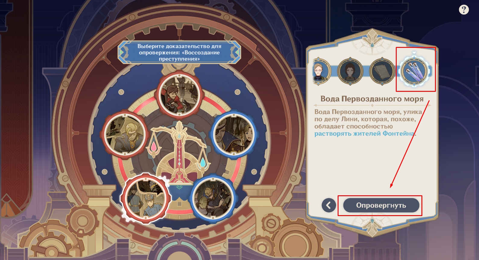 Собрав достаточно доказательств, Путешественница и Паймон отправятся в оперный театр «Эпиклез», где все еще идет суд. Когда настанет время предъявить улики, выберите из списка записную книжку девушки-океаниды.