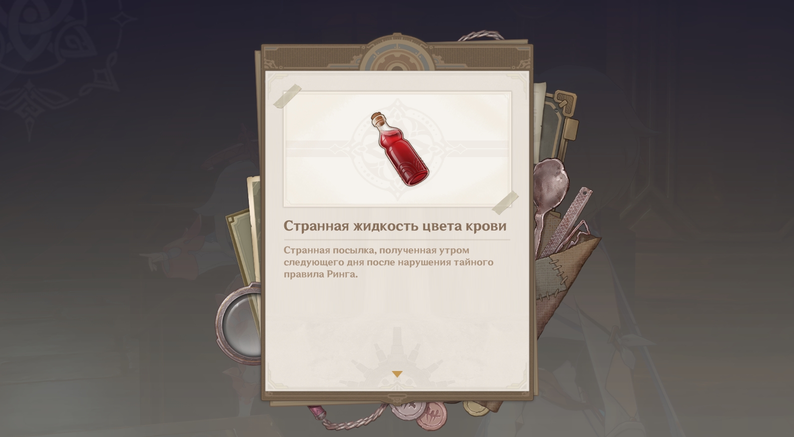 - Сделав ставку на обоих бойцов, вы вернетесь в бараки и там поговорите со стражником Филдингом. Он принес посылку, в которой лежит бутылочка со странной жидкостью.