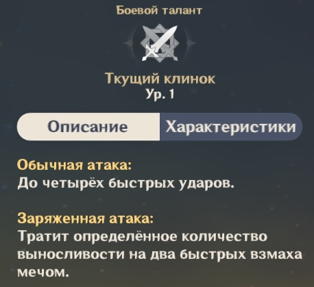 При использовании навыка «Ткущий клинок» герой совершает до 4 быстрых ударов мечом. Заряженная атака – персонаж дважды взмахивает мечом и тратит при этом часть запаса выносливости.
