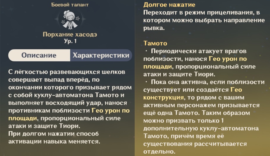- Элементальный навык героя призывает на поле боя куклу-автоматона Тамото, которая периодически наносит противникам гео-урон. Если рядом есть гео-конструкция, вместо одной куклы будет призвано две, что фактически удваивает наносимый умением «Порхание хасодэ» урон;