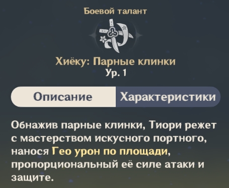 Активировав способность «Хиёку: Парные клинки», герой наносит АОЕ-урон от Гео, сила которого пропорциональна его силе атаки и защиты.