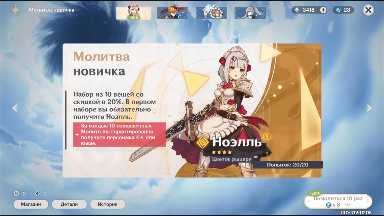 - Молитва новичка с гарантированным 4х звездочным персонажем Ноэль;