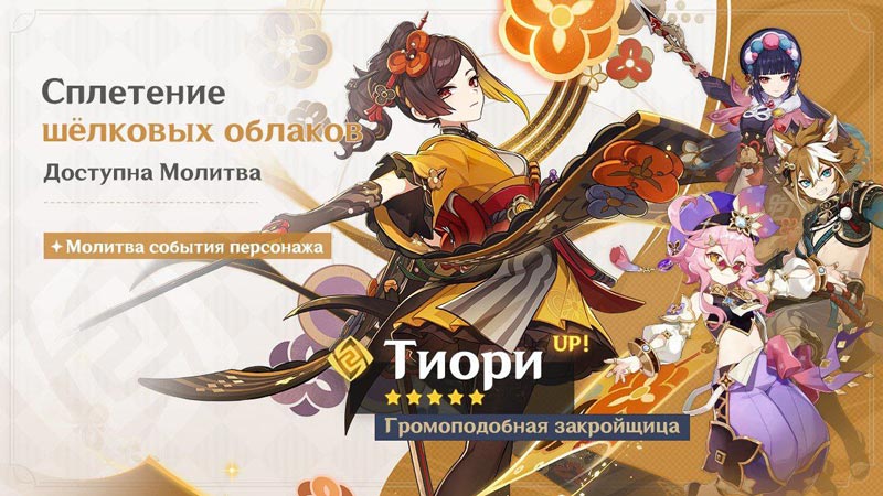 С 13 марта по 2 апреля 2024 года появилась новенькая гео мечница Тиори вместе с Аратаки Итто, «Ураку мисугири» и «Краснорогим камнерубом».