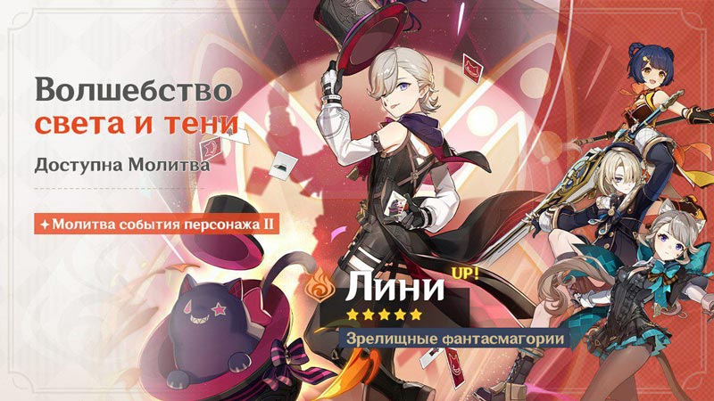 Вместе с выходом Фонтейна с 16 августа по 5 сентября 2023 года были доступны молитвы с новеньким пиро лучником Лини и Е Лань, вместе с их сигнами «Первым великим фокусом» и «Аква симулякрумом».