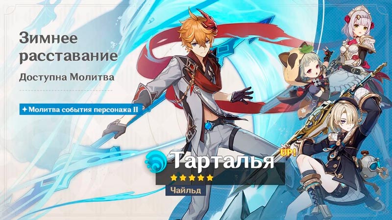 С 11 по 30 ноября 2020 года игроки могли получить гидро лучника Тарталью из гачи на персонажа, а из оружейного – «Небесное крыло» и «Память о пыли».